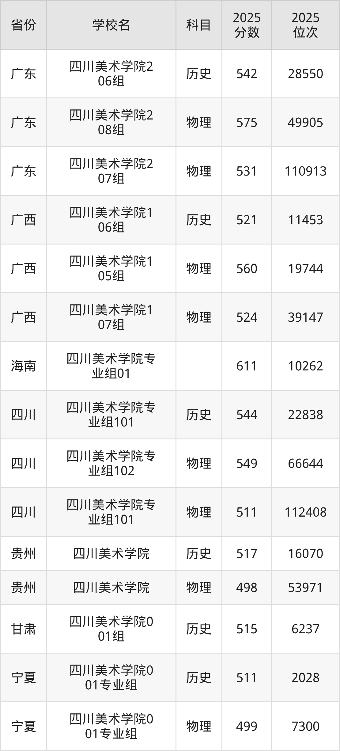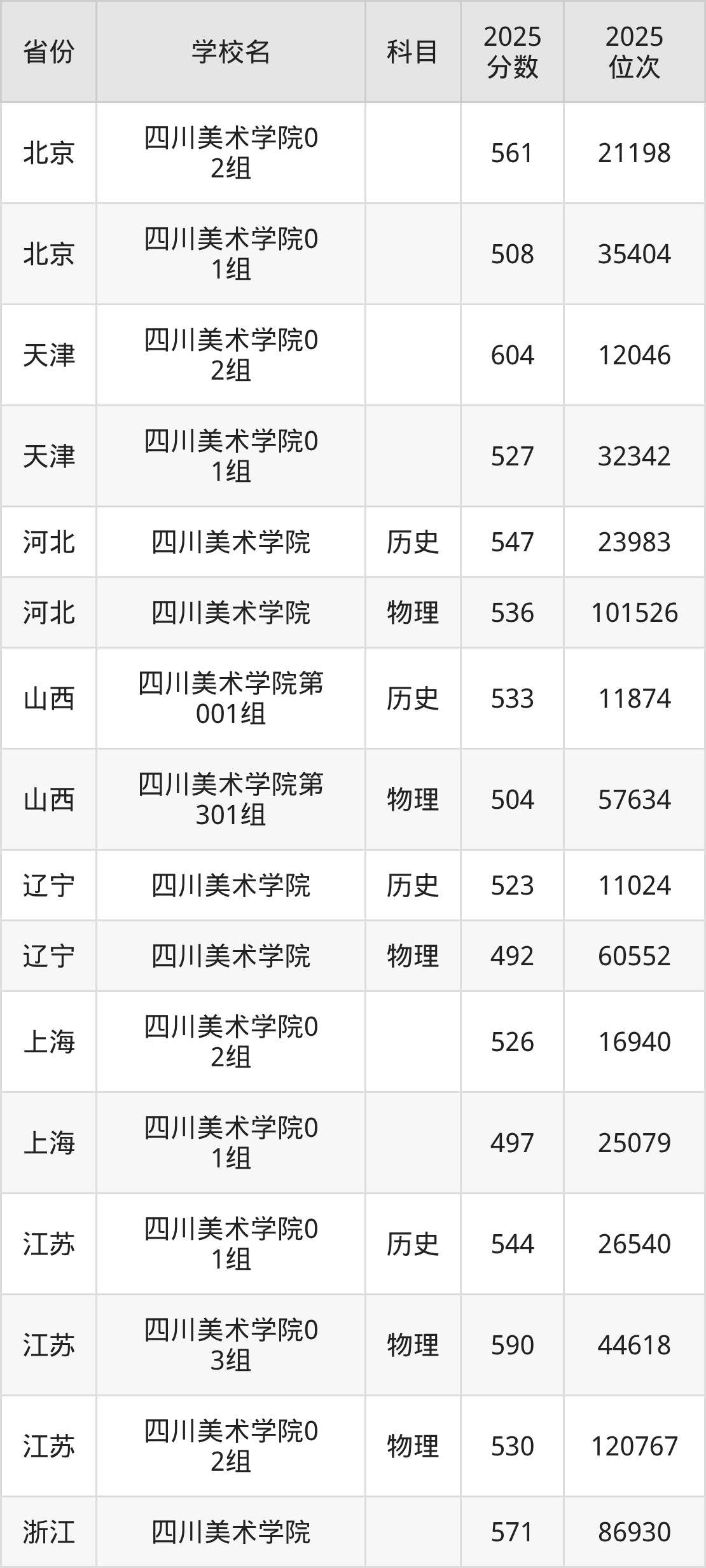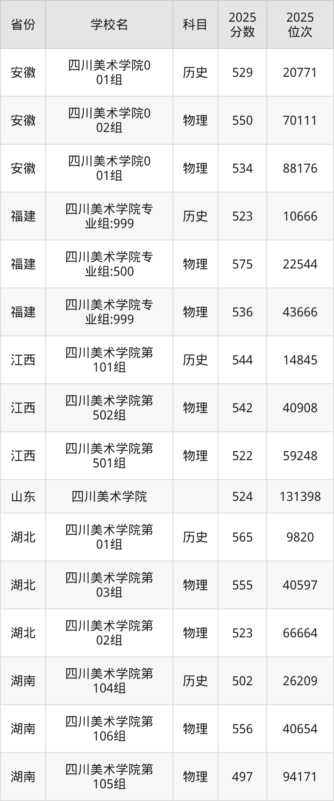 2025年四川美术学院历史类最低分506分(16288名)、物理类最低分510分(55724名)。