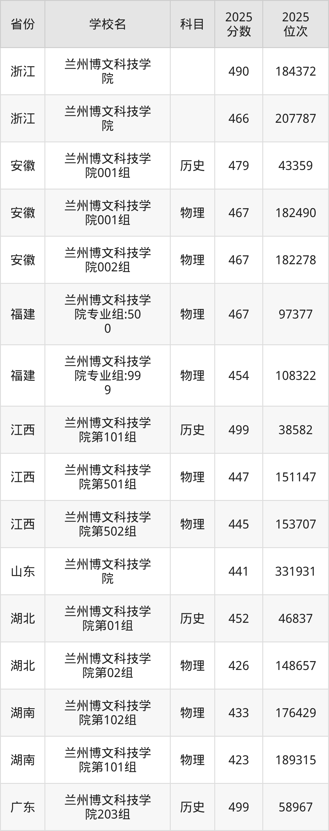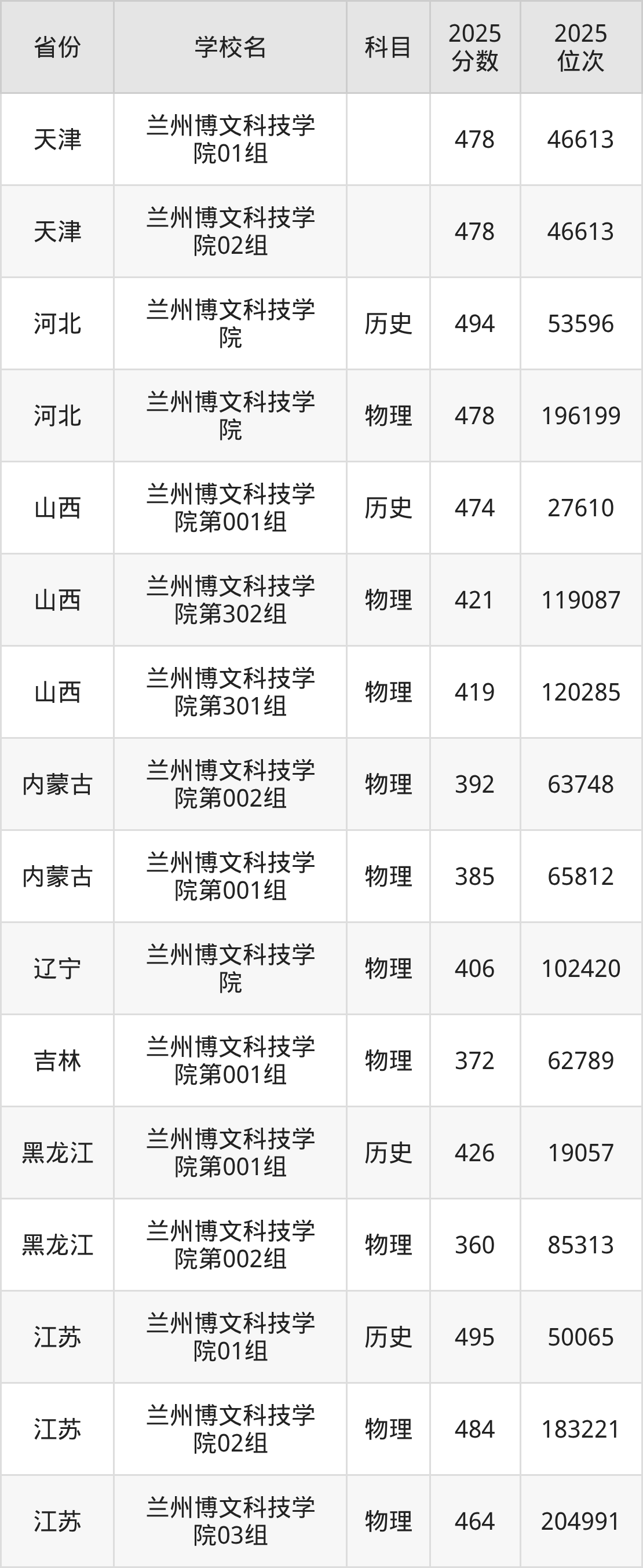 2025年兰州博文科技学院在省内分历史物理科目类录取,其中历史类最低分是412分、对应位次是25282名;物理类最低分是374分,对应位次是93788名。
