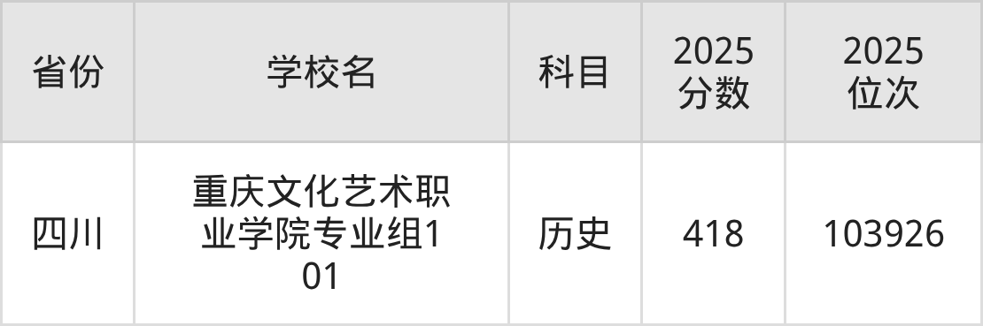 2025年重庆文化艺术职业学院在市外录取分数线是418分,录取分数线最低在四川历史(专业组101)。