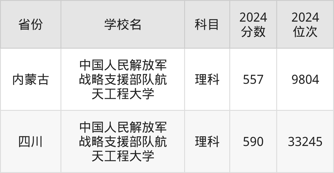 2024年中国人民解放军战略支援部队航天工程大学在市外录取分数线范围整体位于557分到590分之间,录取分数线最低在内蒙古理科、录取分数线最高在四川理科。