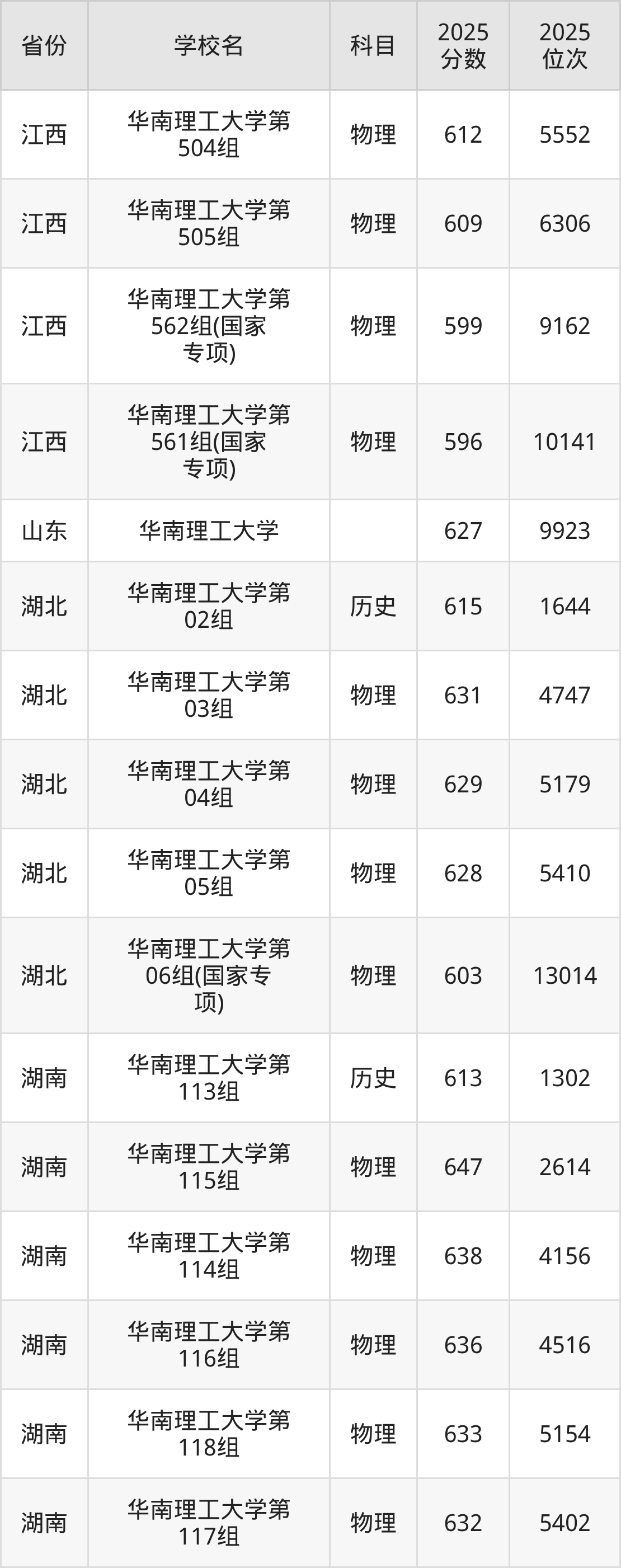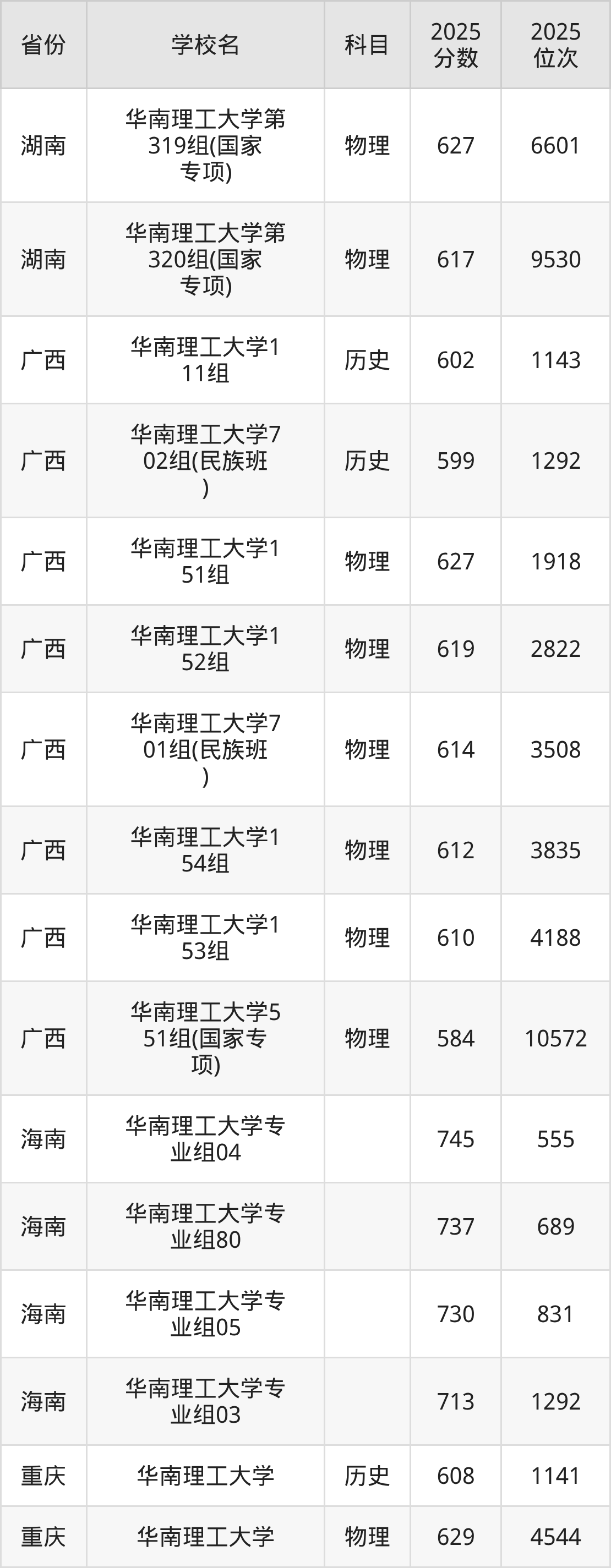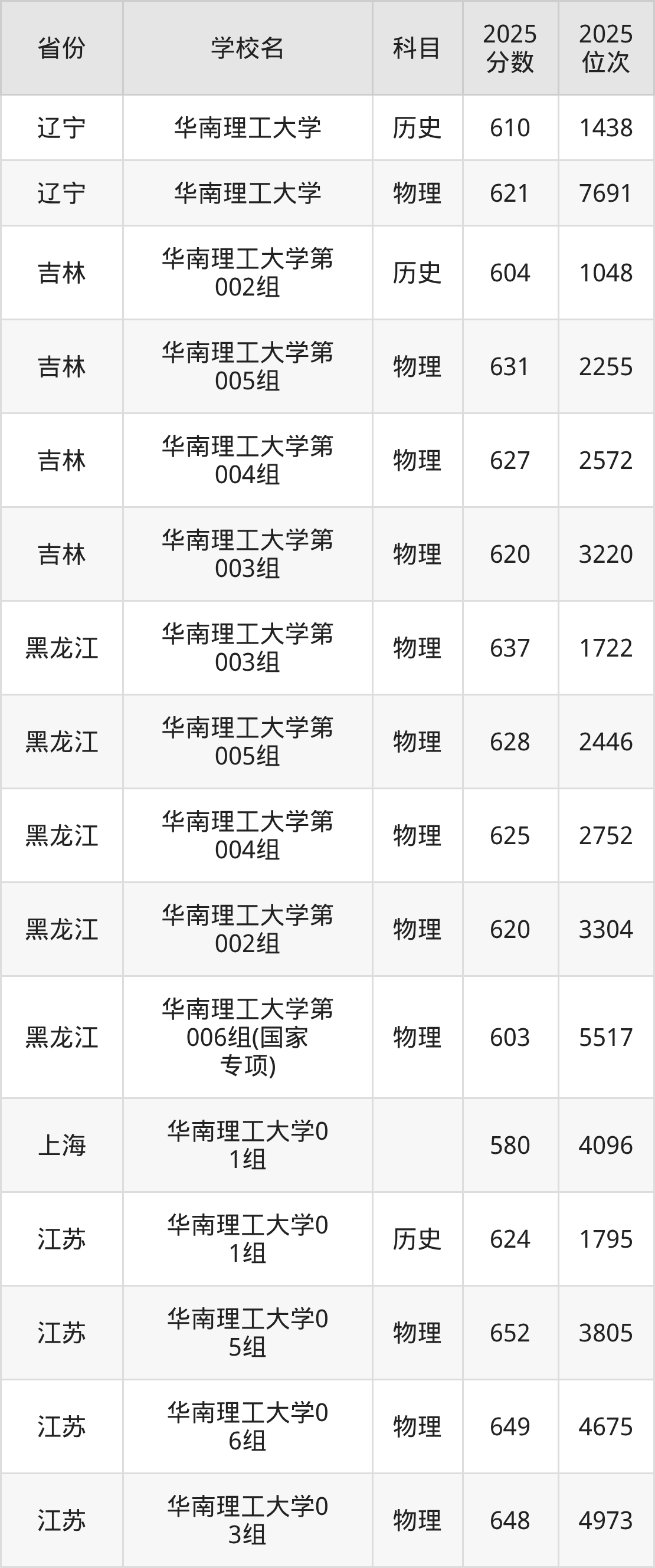 2025年华南理工大学历史类最低分615分(2478名)、物理类最低分622分(12953名)。