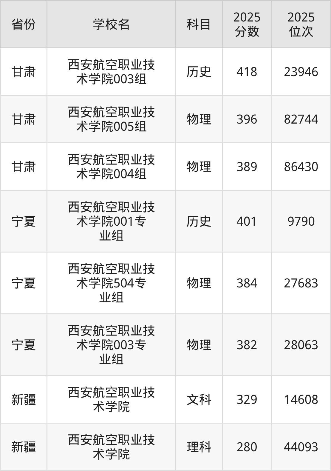 2026年西安航空职业技术学院录取分数线预计在410分及以上,在各省录取最低分存在一定差异,如:2025年西安航空职业技术学院在广西录取最低物理类377分,在贵州录取最低物理类360分,在宁夏录取最低历史类401分、物理类382分。