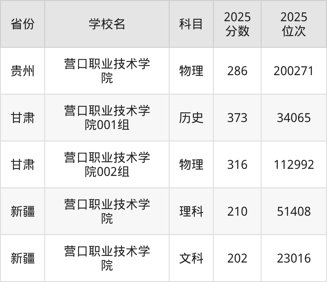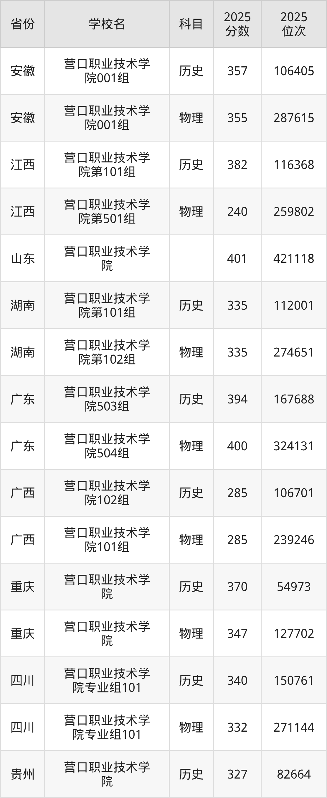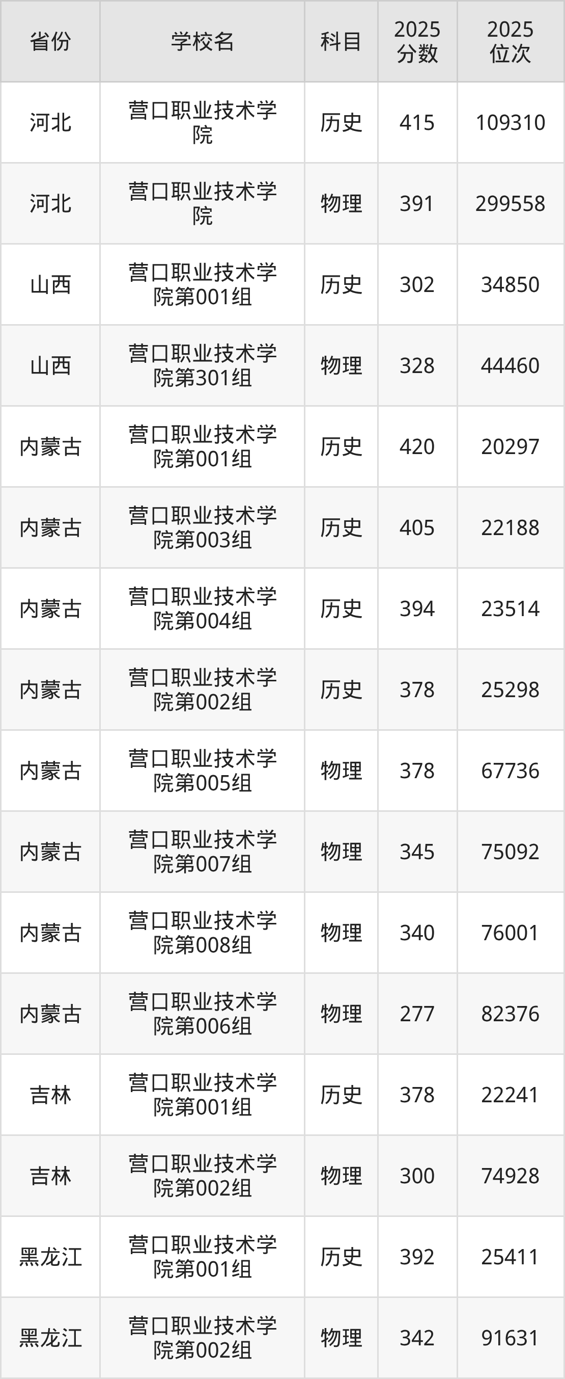 2025年营口职业技术学院历史类最低分319分(48275名)、物理类最低分294分(136083名)。