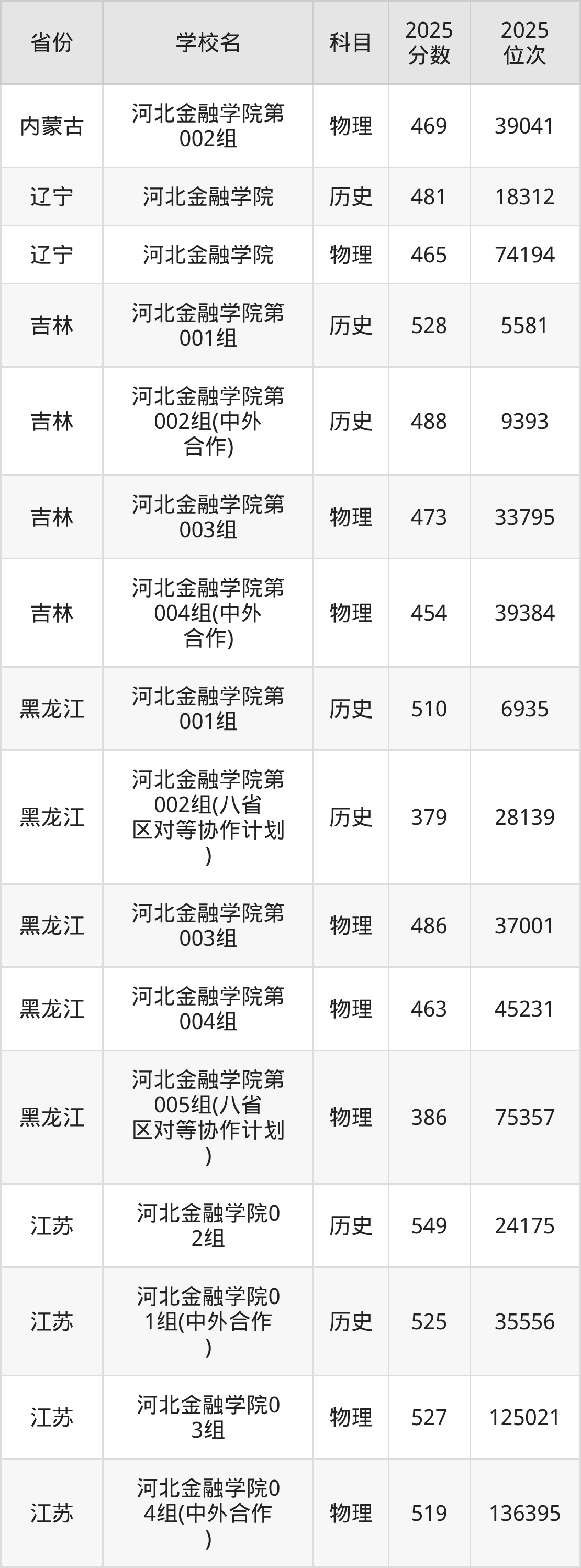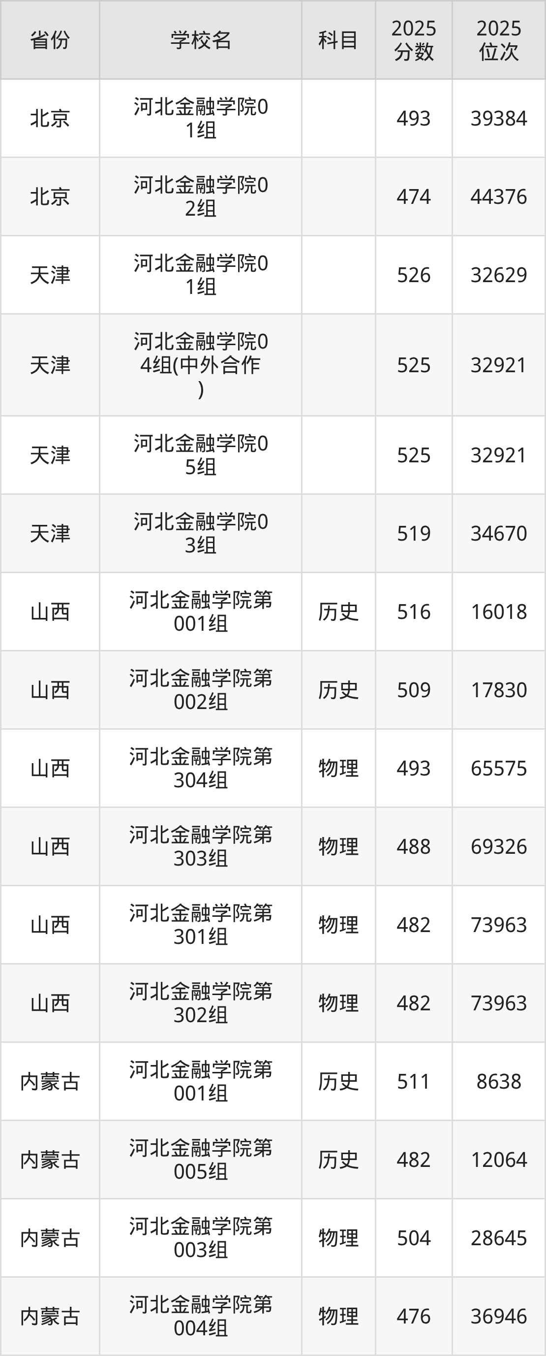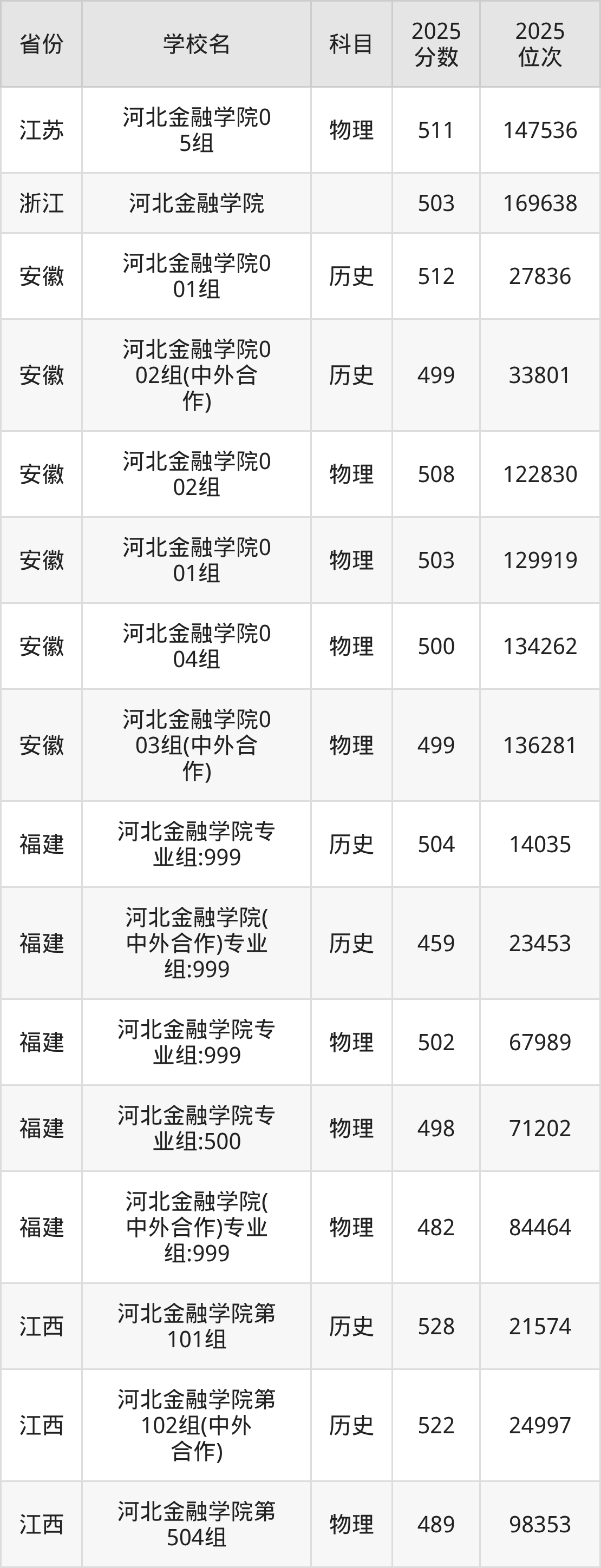2025年河北金融学院历史类最低分477分(64897名)、物理类最低分459分(224230名)。