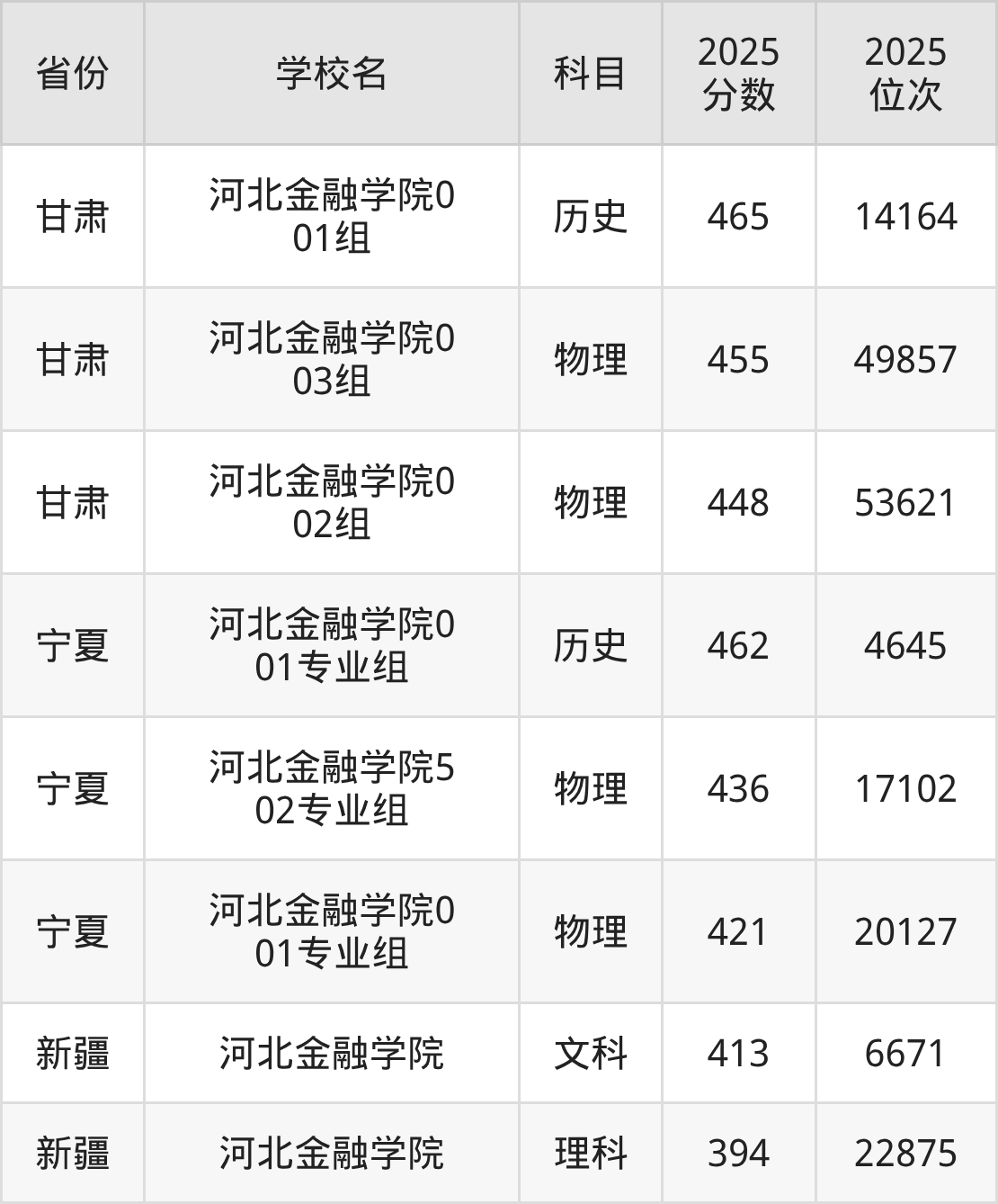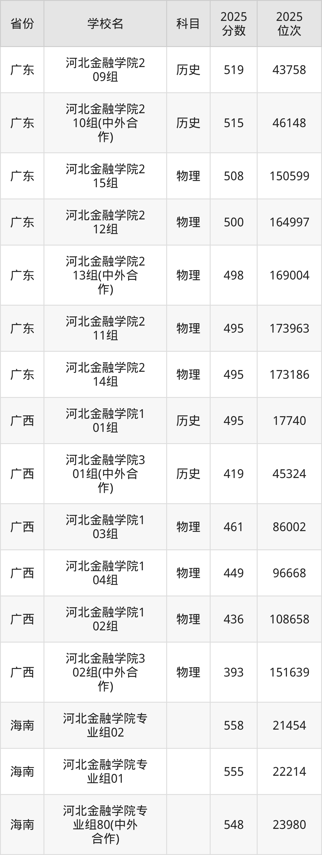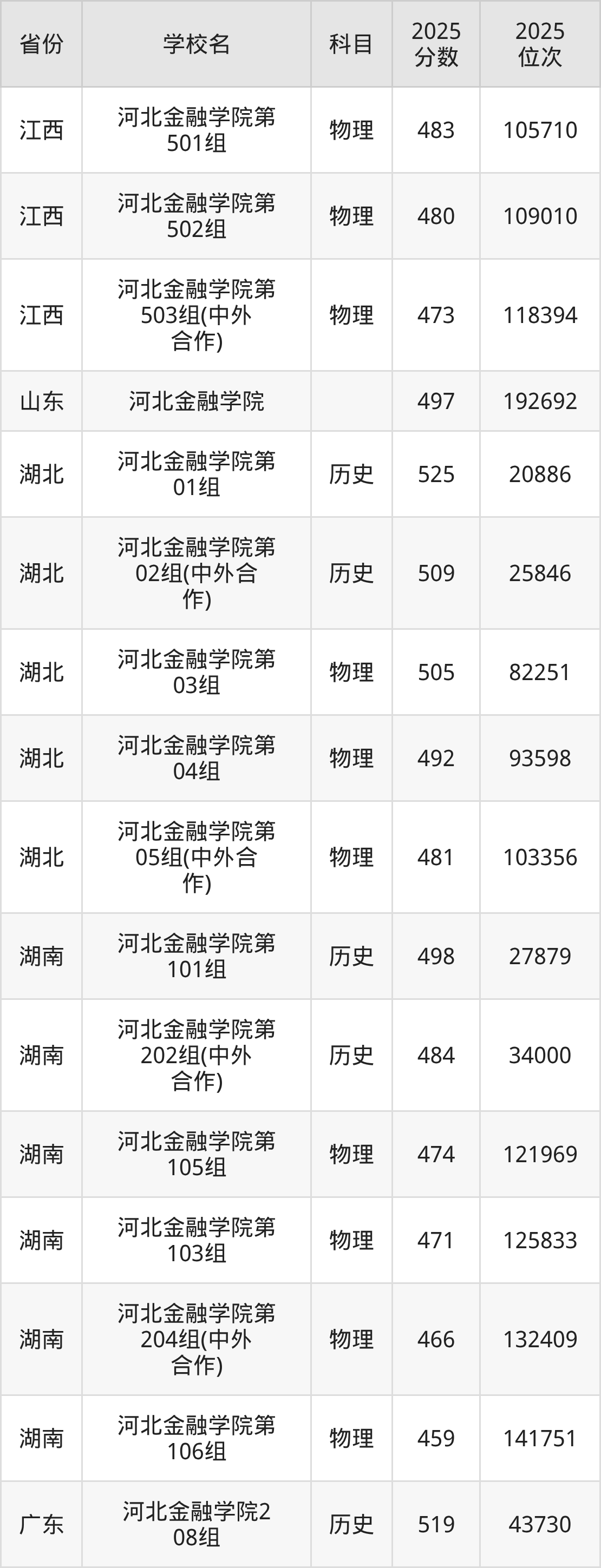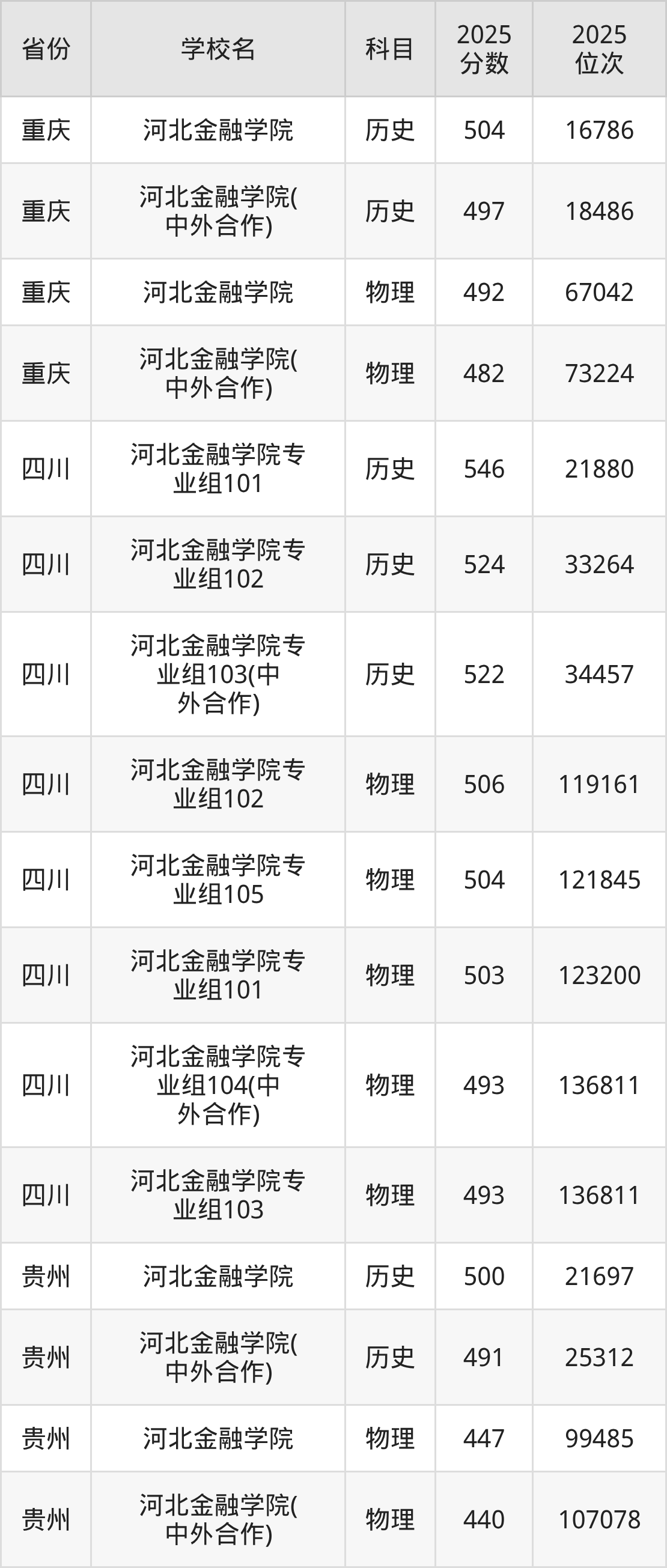 2025年河北金融学院历史类最低分477分(64897名)、物理类最低分459分(224230名)。