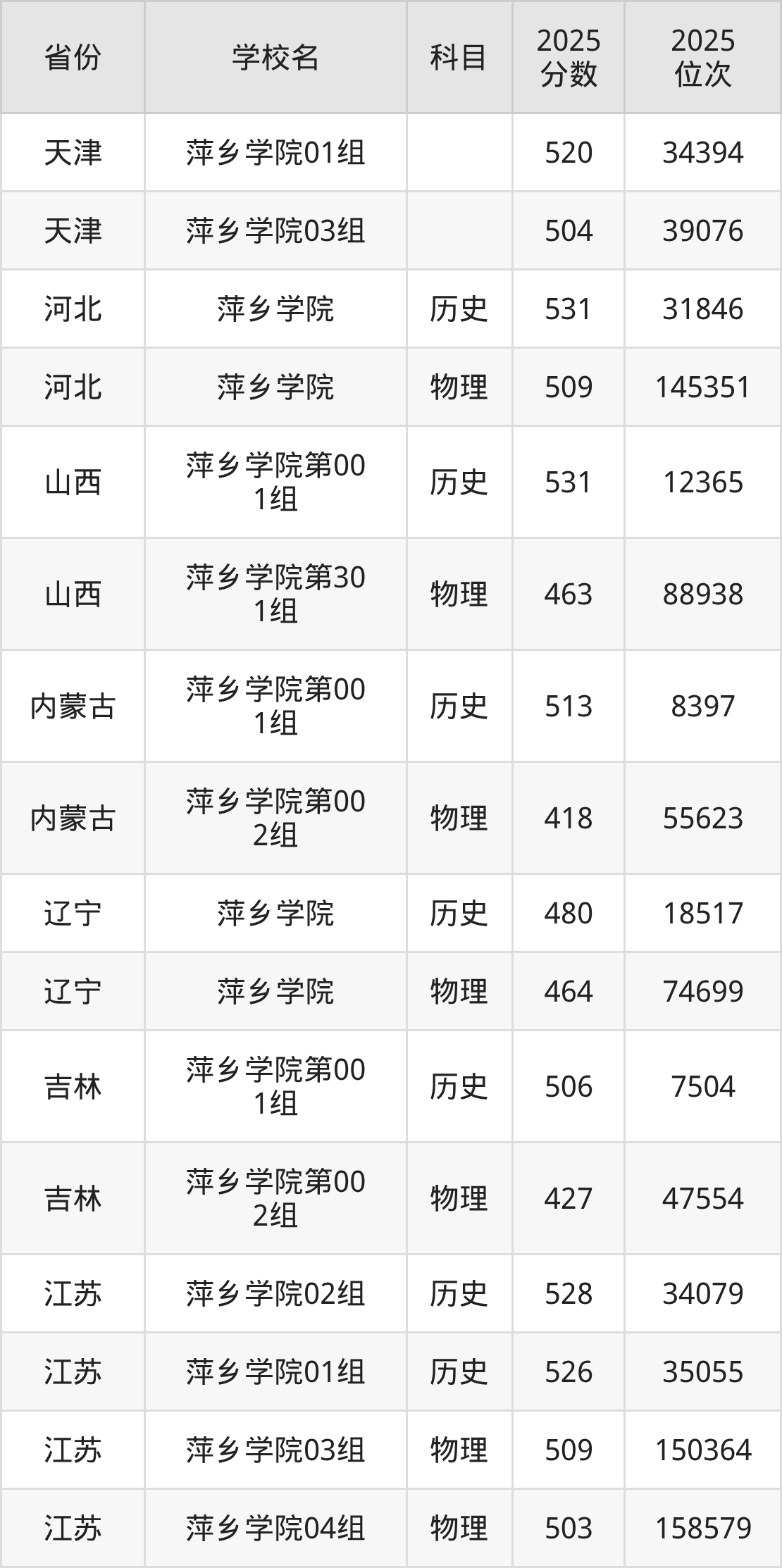 2025年萍乡学院历史类最低分517分(27667名)、物理类最低分470分(122690名)。