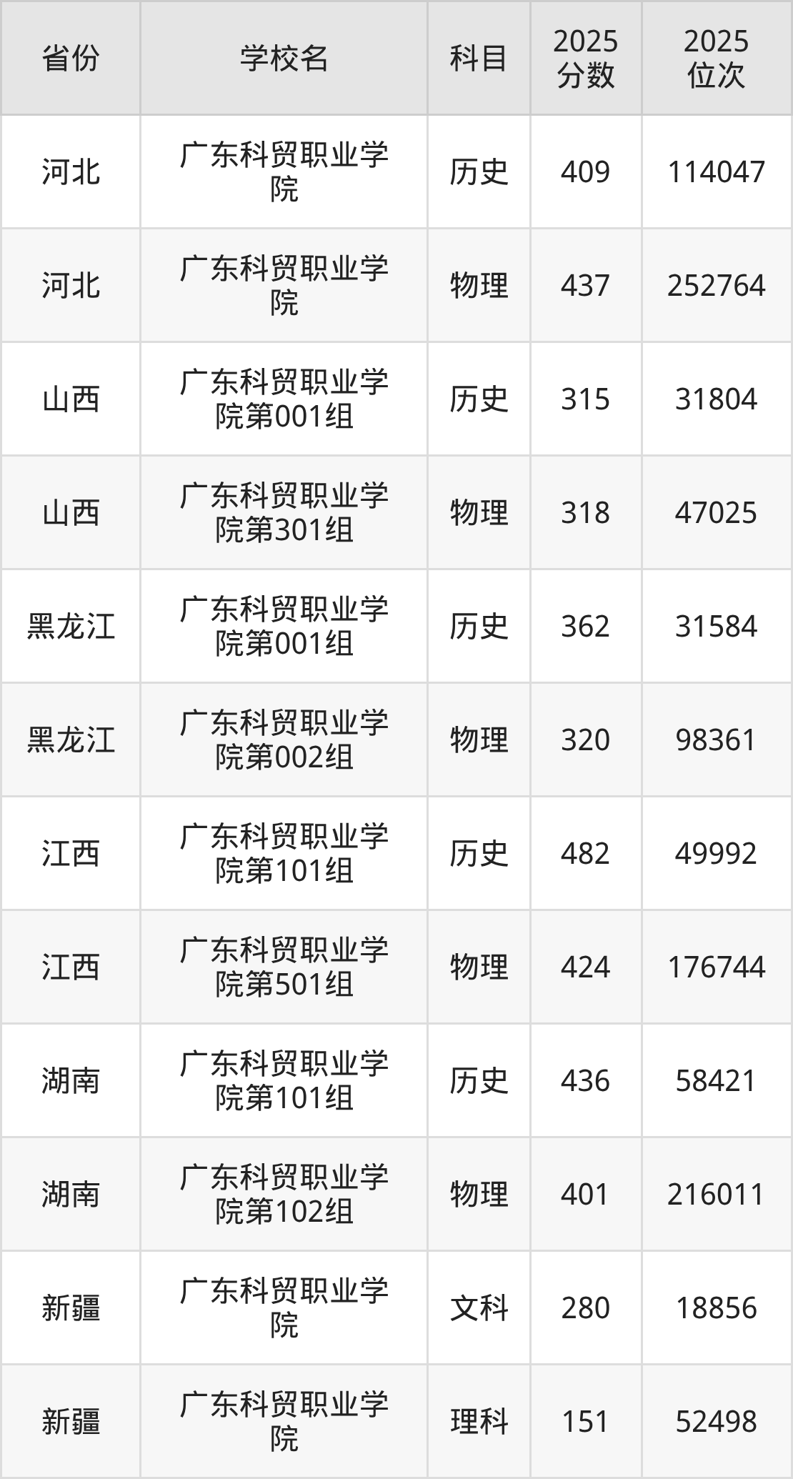 下面是广东科贸职业学院2025年录取分数线各省汇总,一起来了解下吧。
