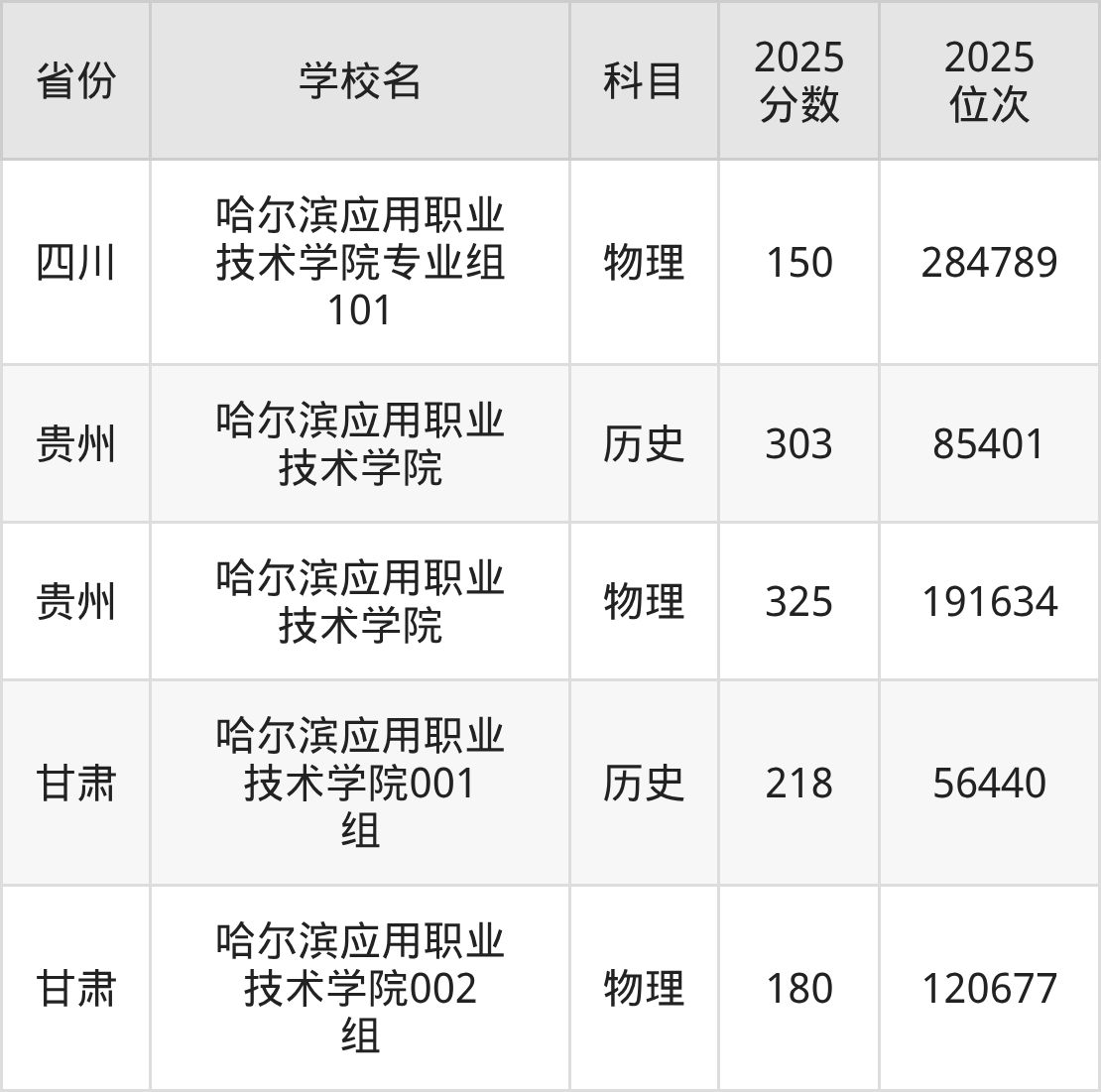 2025年哈尔滨应用职业技术学院在省内分历史物理科目类录取,其中历史类最低分是160分、对应位次是54577名;物理类最低分是161分,对应位次是117300名。