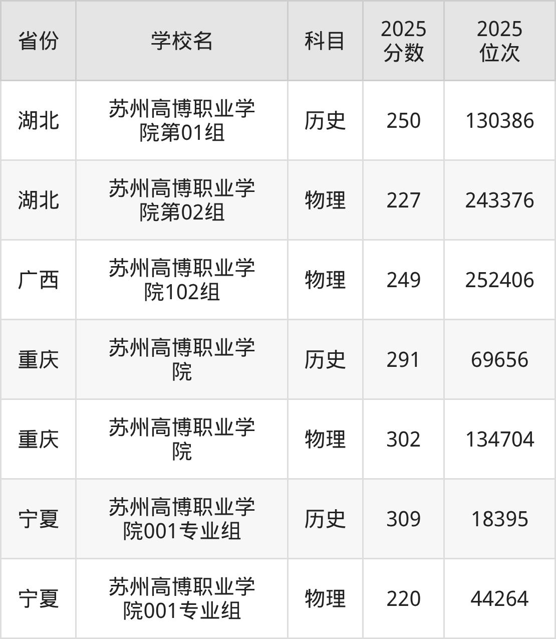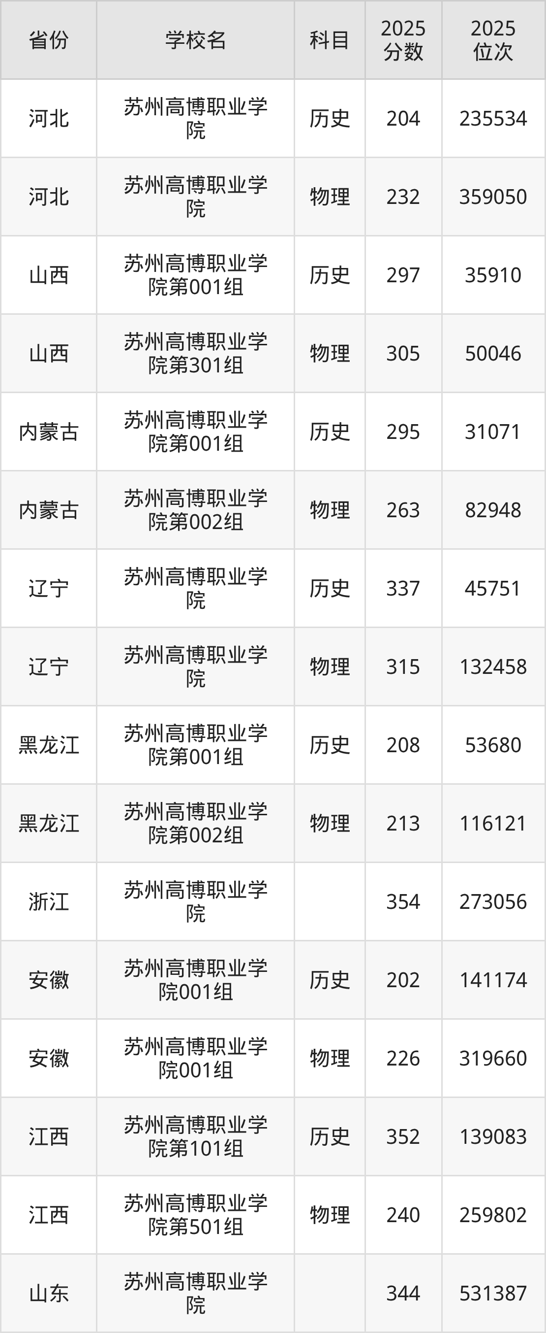 2025年苏州高博职业学院在省内分历史物理科目类录取,其中历史类最低分是256分、对应位次是44412名;物理类最低分是220分,对应位次是66935名。