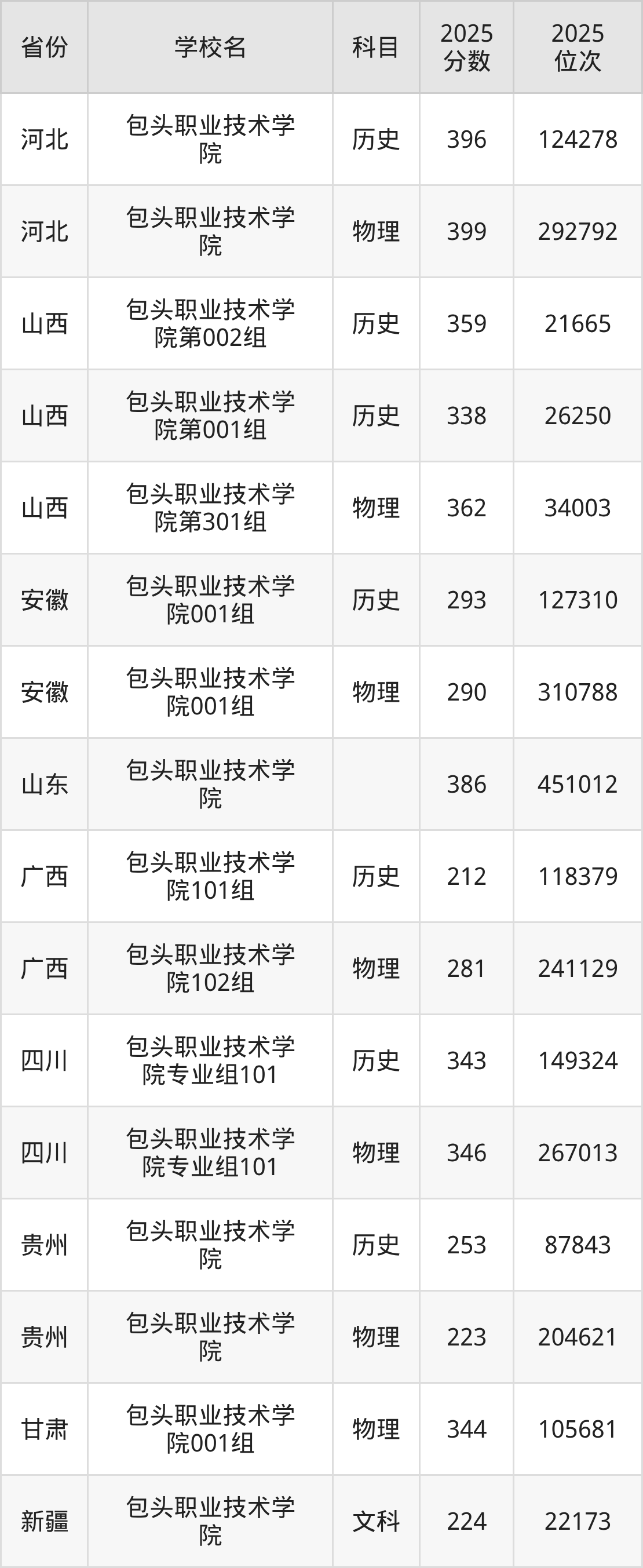 下面是包头职业技术学院2025年录取分数线各省汇总,一起来了解下吧。