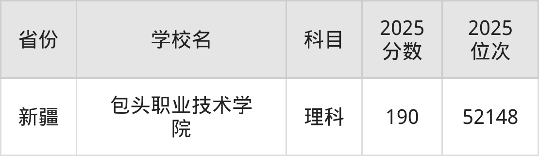 2025年包头职业技术学院在自治区内分历史物理科目类录取,其中历史类最低分是211分、对应位次是32597名;物理类最低分是189分,对应位次是0名。