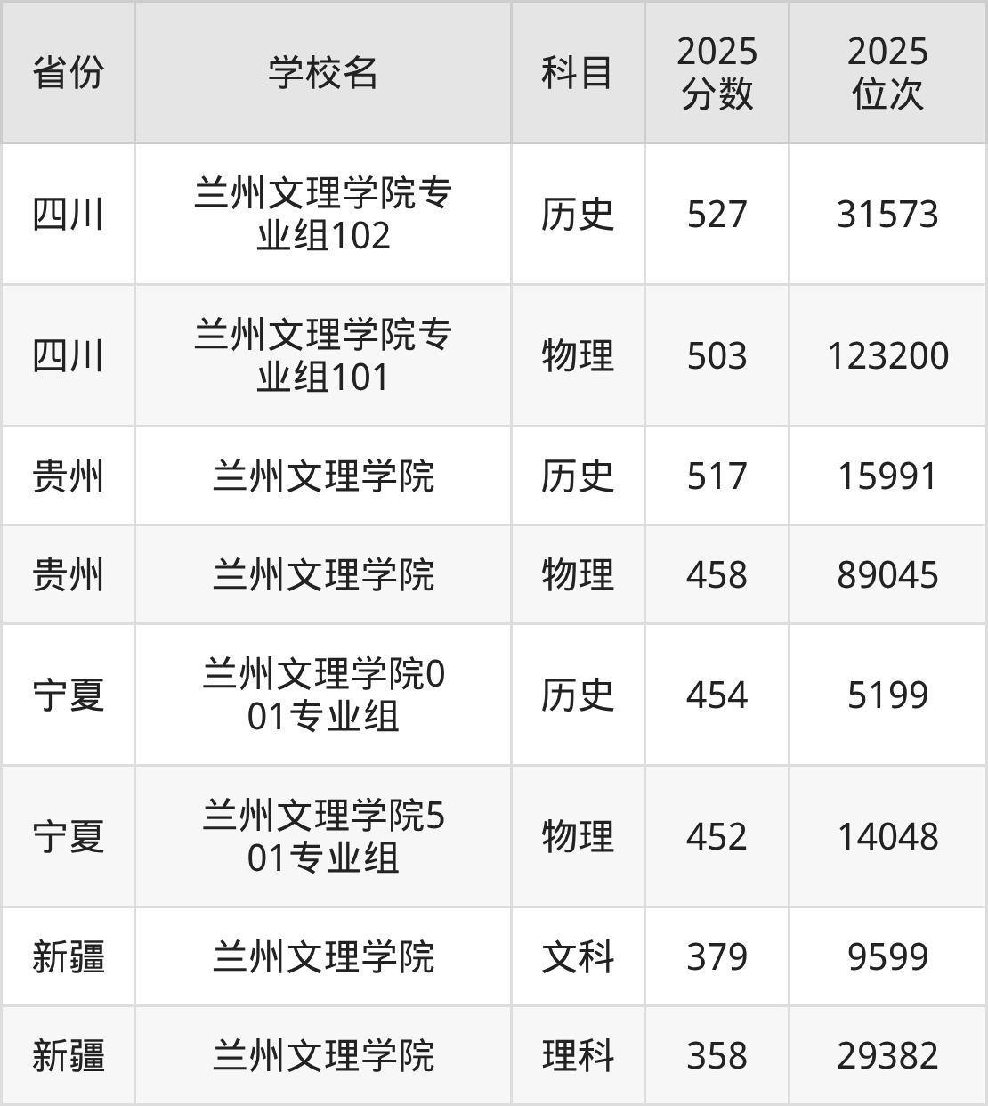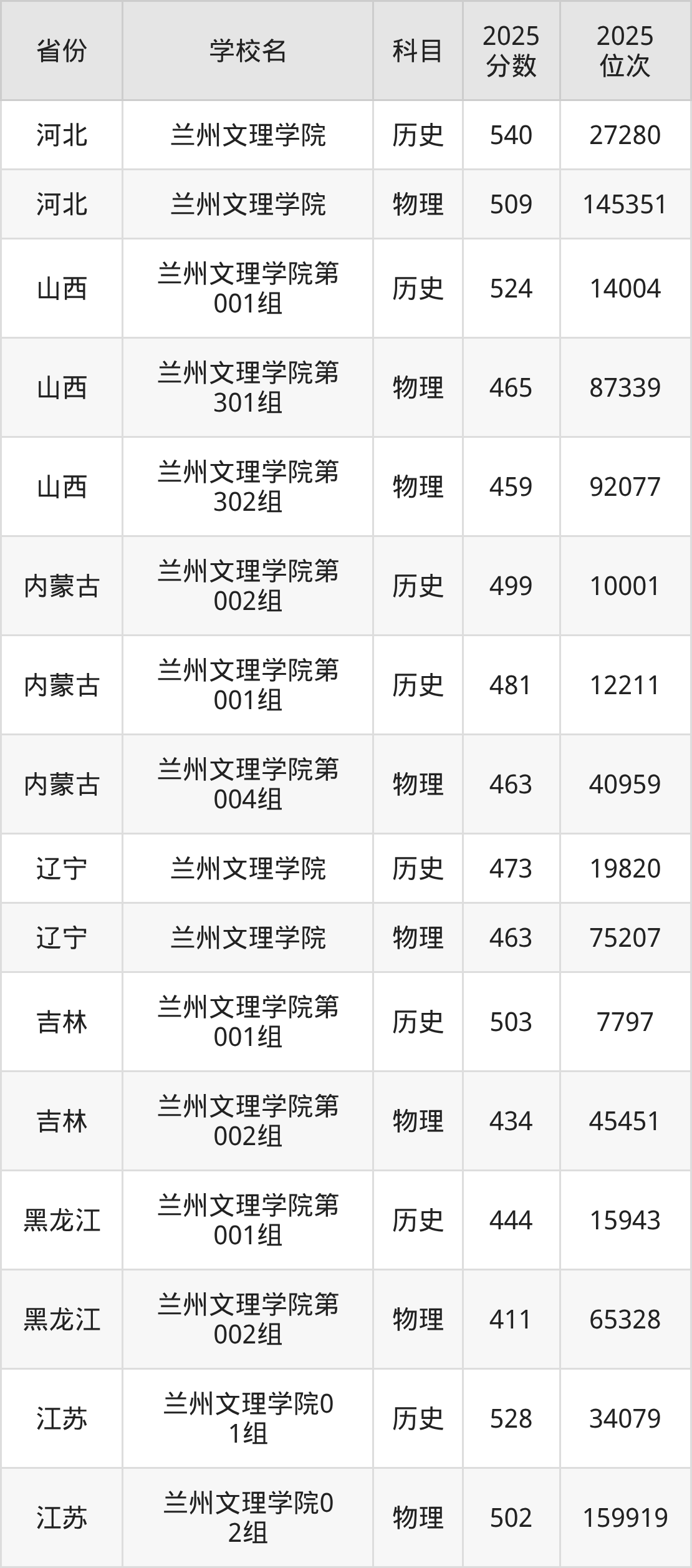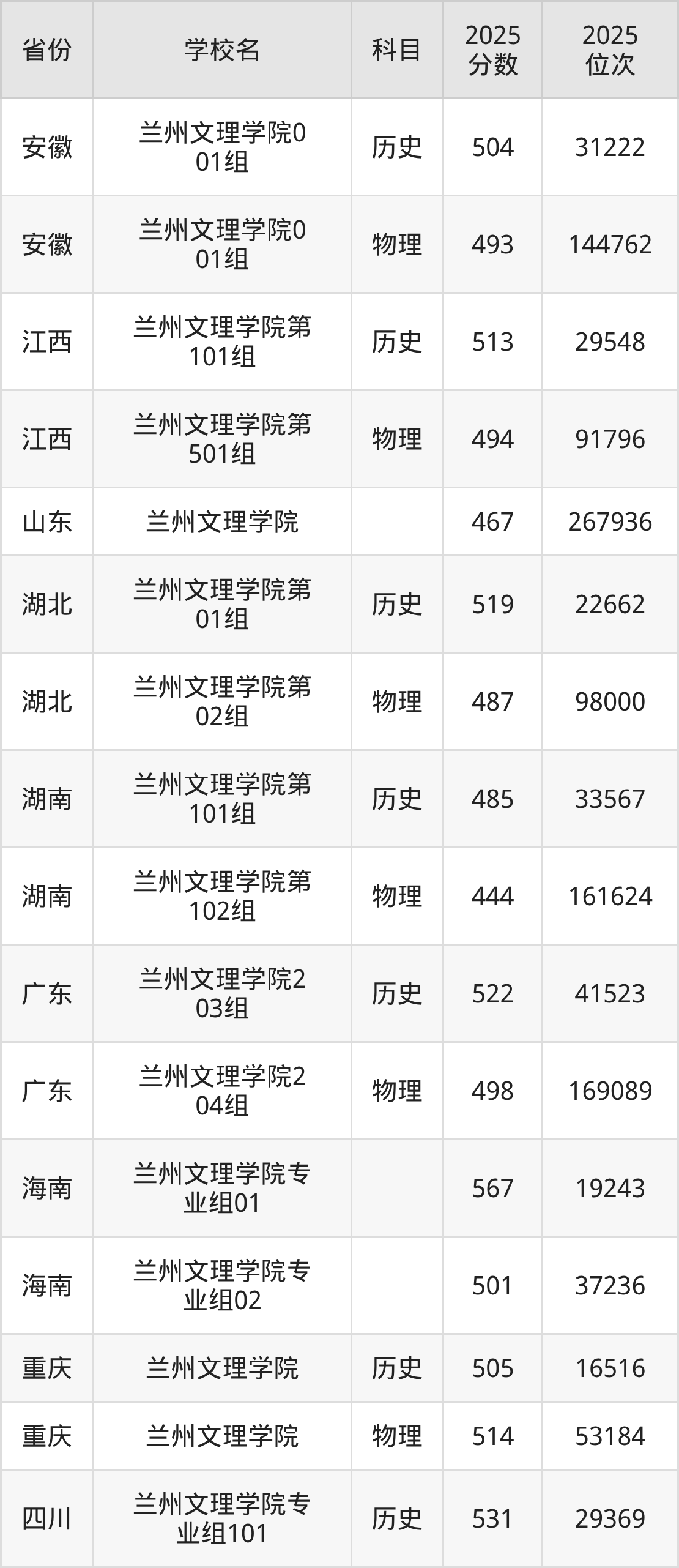 2025年兰州文理学院历史类最低分360分(37198名)、物理类最低分343分(106003名)。