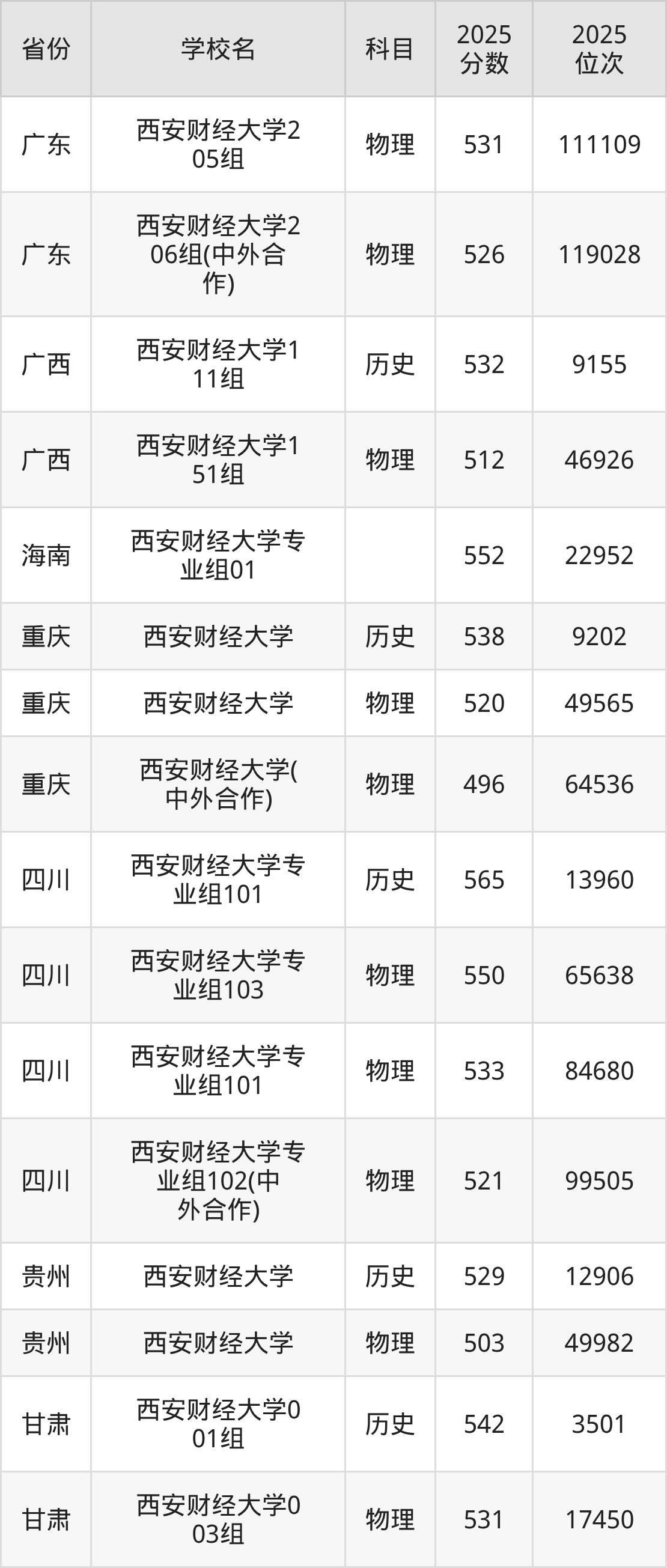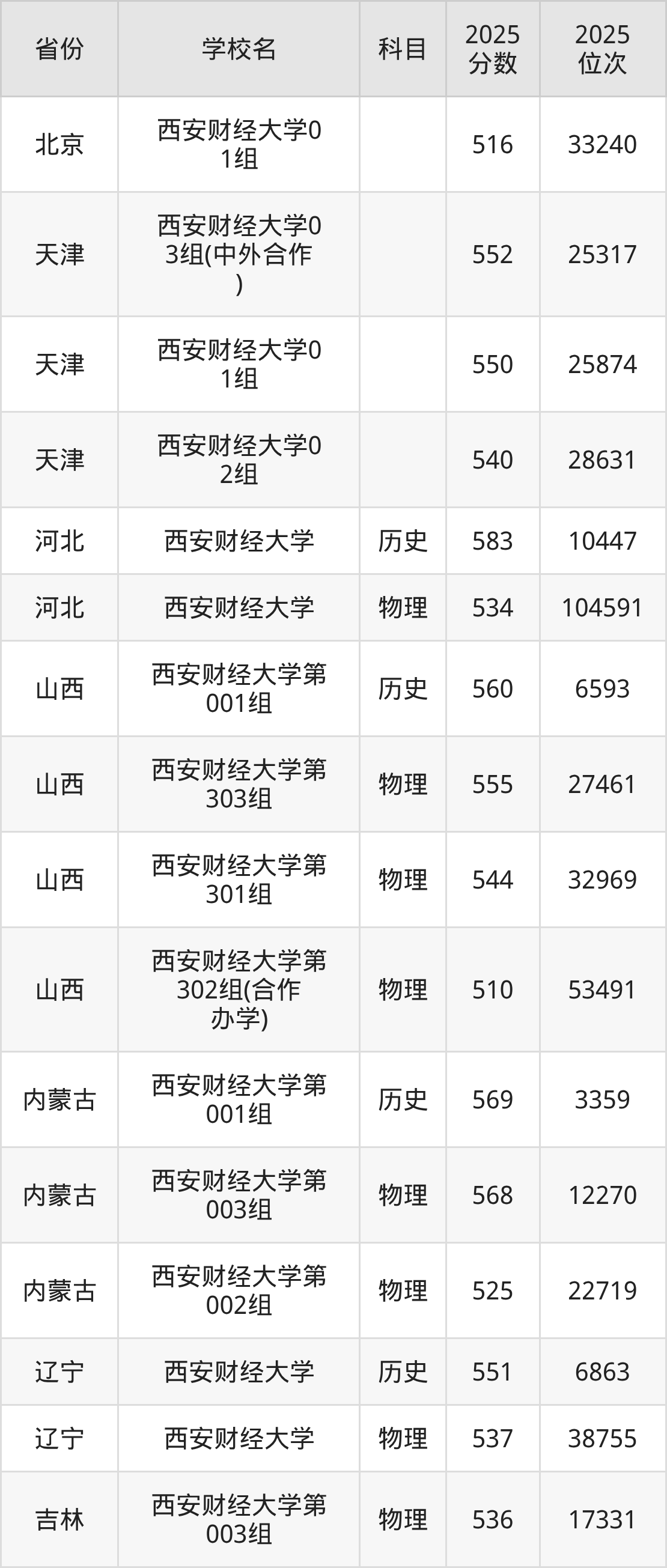 2026年西安财经大学录取分数线预计在530分及以上,在各省录取最低分存在一定差异,如:2025年西安财经大学在天津录取最低分是540分,在浙江录取最低分是556分,在广西录取最低历史类532分、物理类512分。