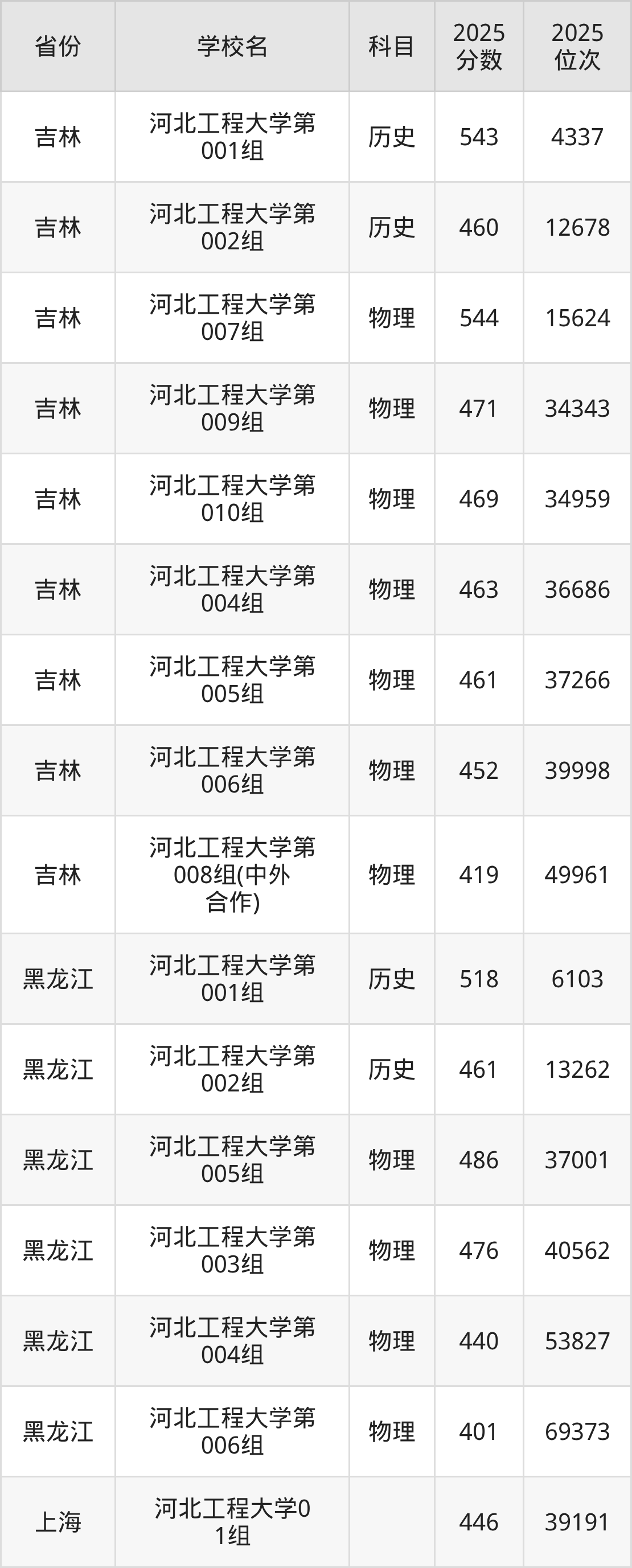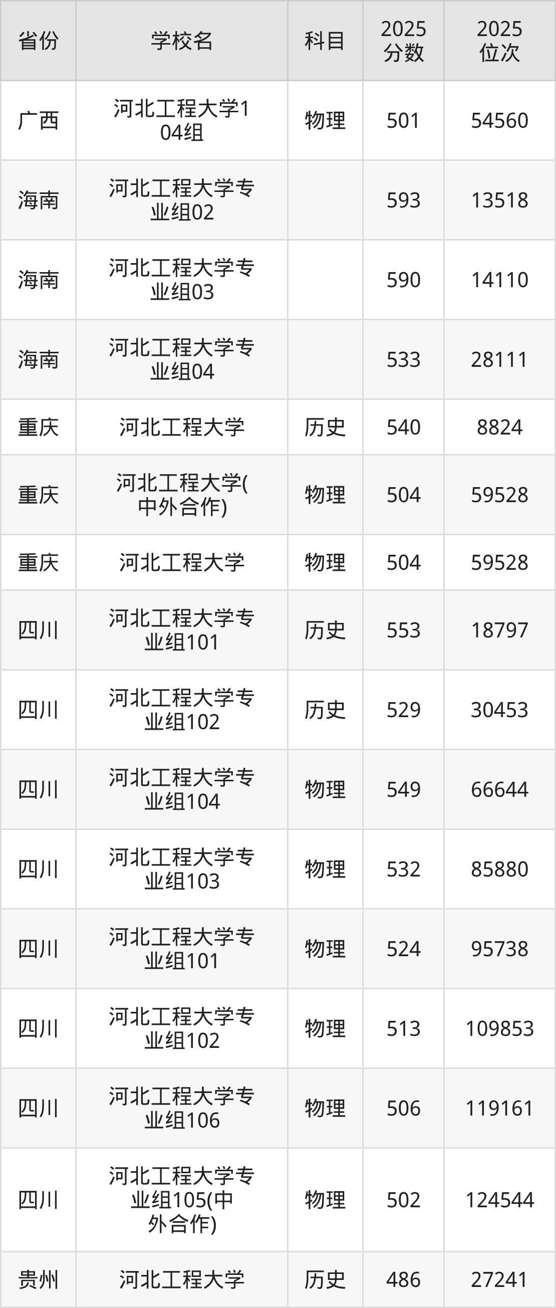 2025年河北工程大学在省外录取分数线范围整体位于401分到593分之间,录取分数线最低在黑龙江物理(第006组)、录取分数线最高在海南(专业组02)。