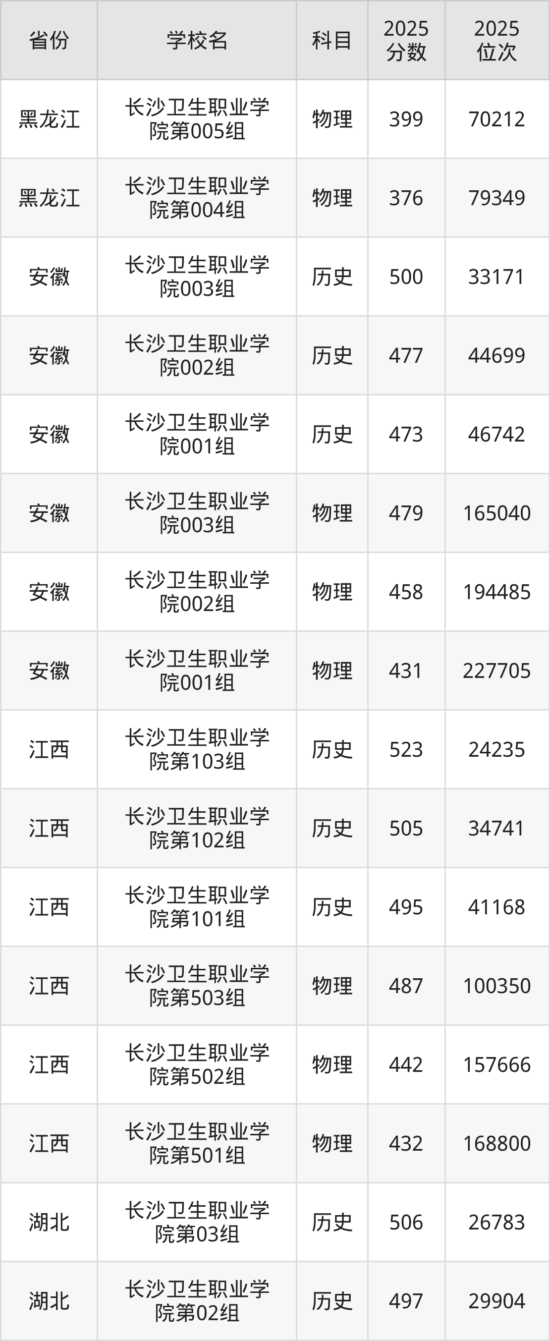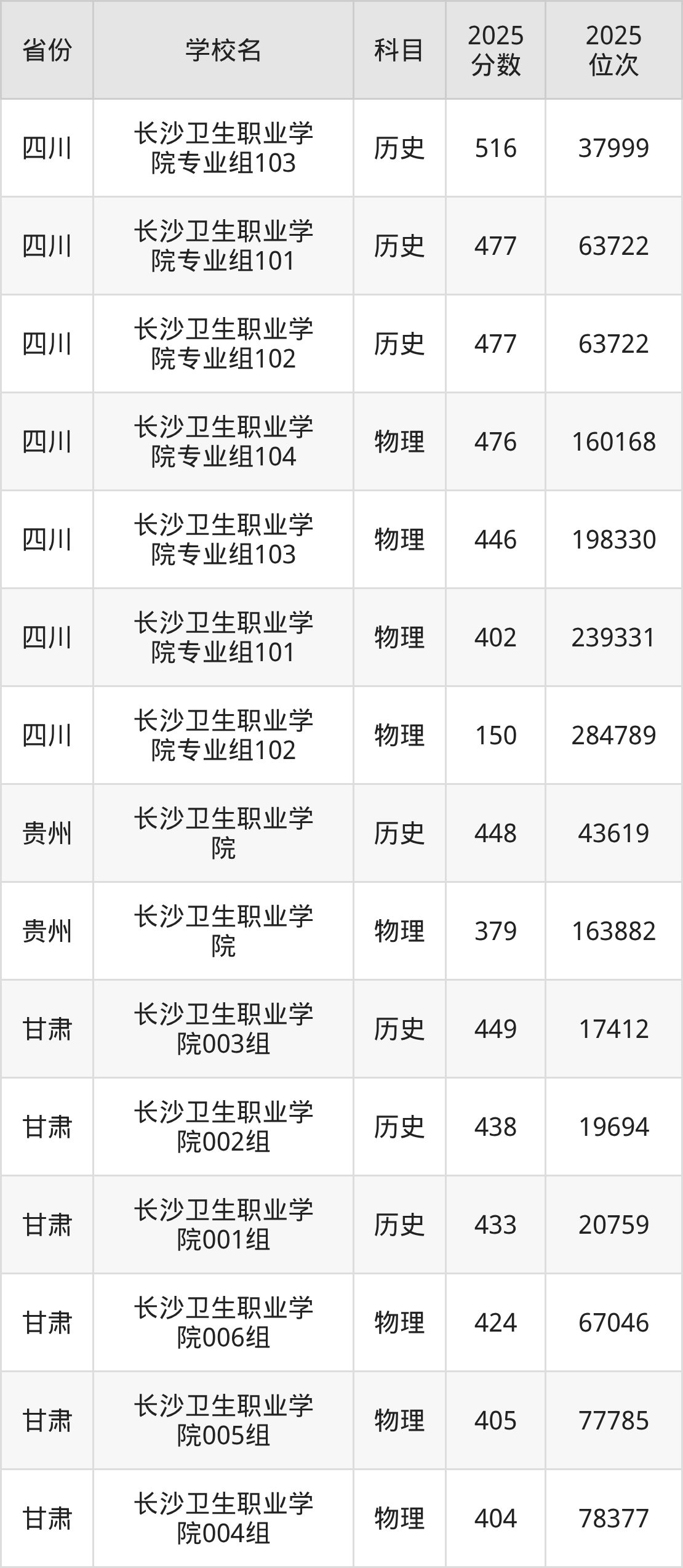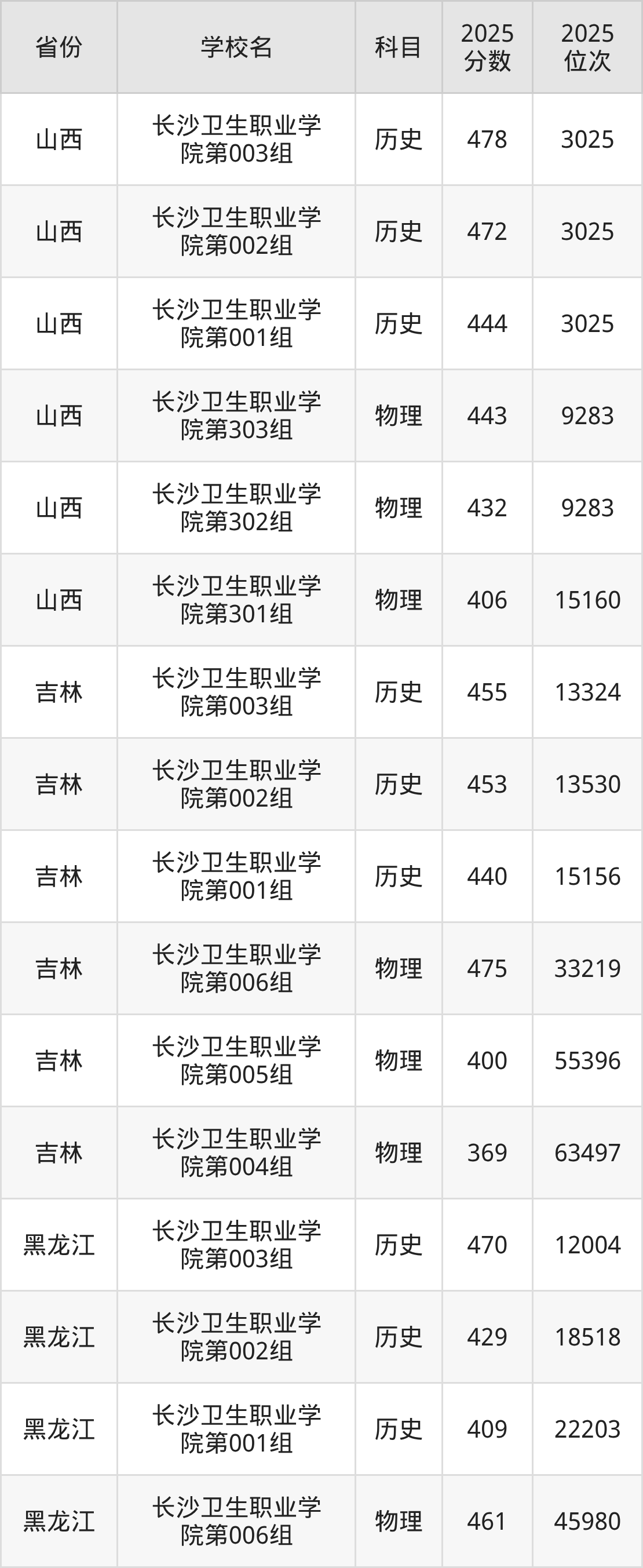 2025年长沙卫生职业学院在省内分历史物理科目类录取,其中历史类最低分是449分、对应位次是51433名;物理类最低分是410分,对应位次是205496名。