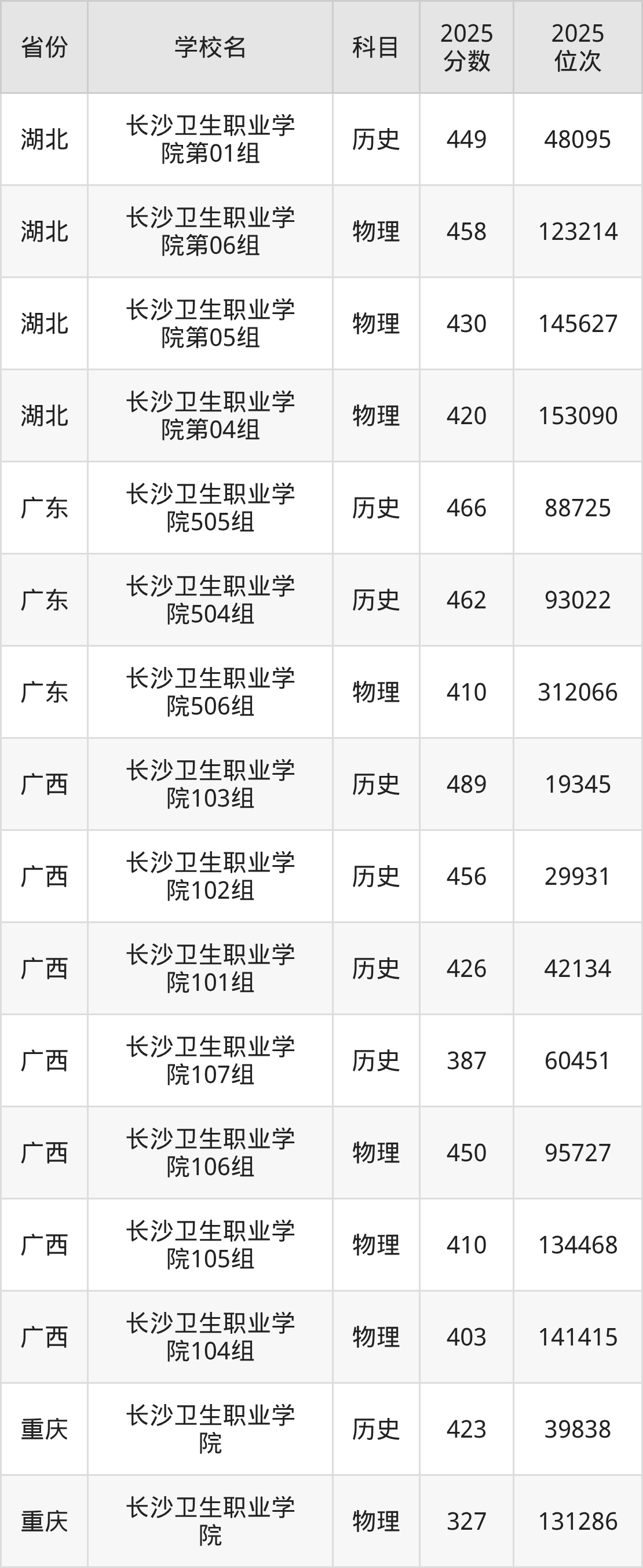 2025年长沙卫生职业学院历史类最低分449分(51433名)、物理类最低分410分(205496名)。