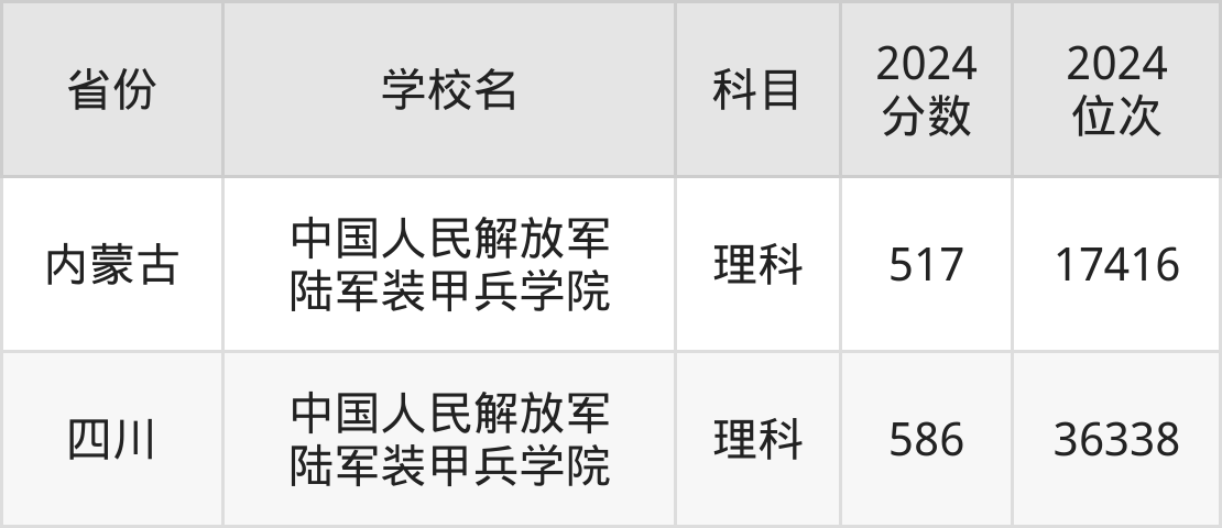 2024年中国人民解放军陆军装甲兵学院理科最低分517分(17416名)。