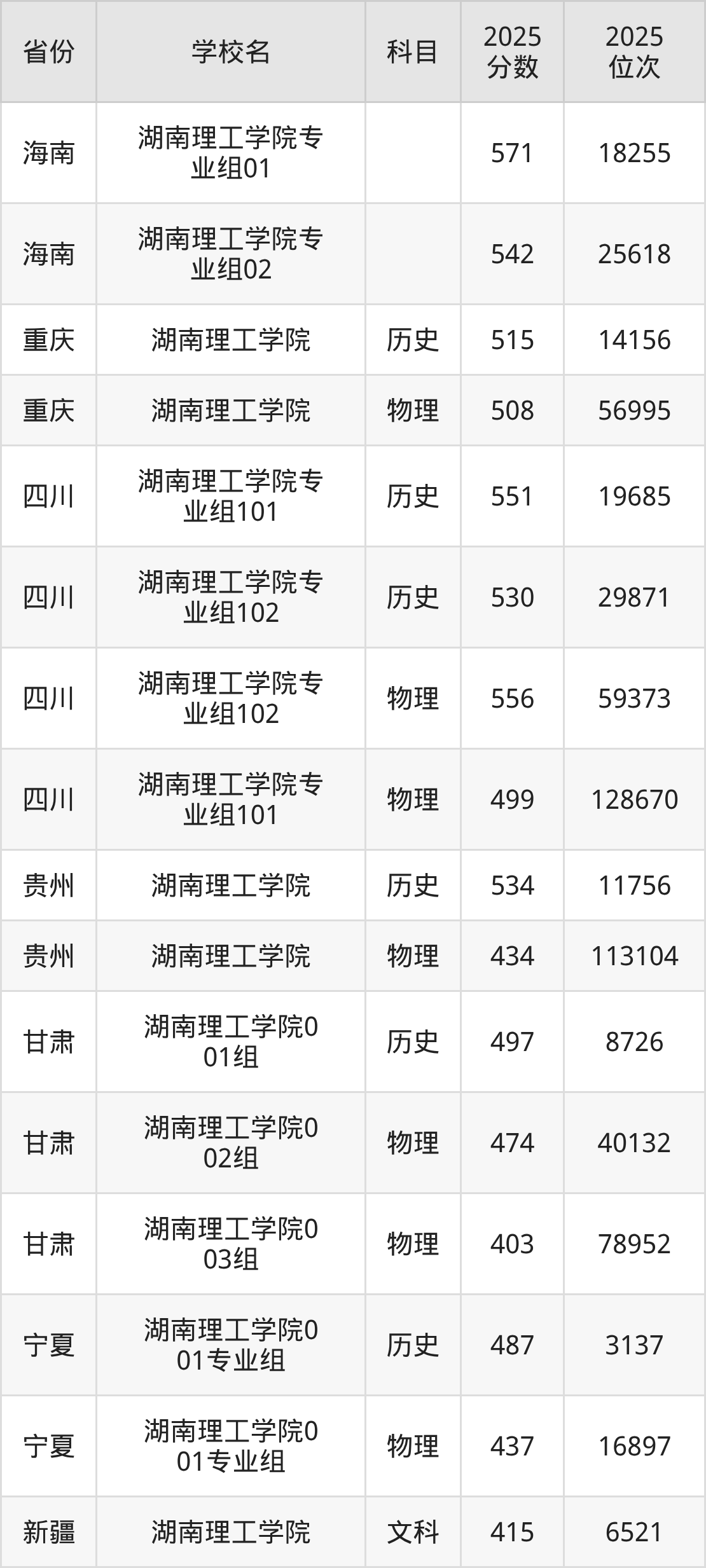 2025年湖南理工学院在省外录取分数线范围整体位于400分到571分之间,录取分数线最低在吉林物理(第003组)、录取分数线最高在海南(专业组01)。