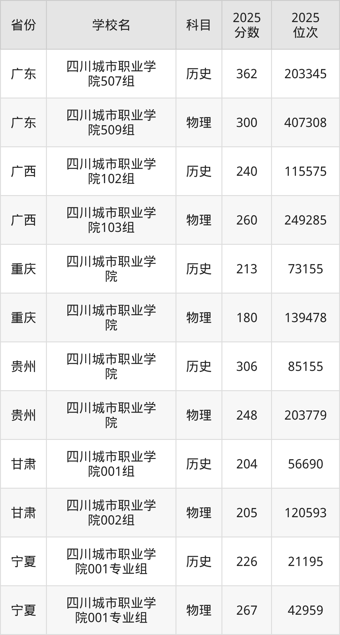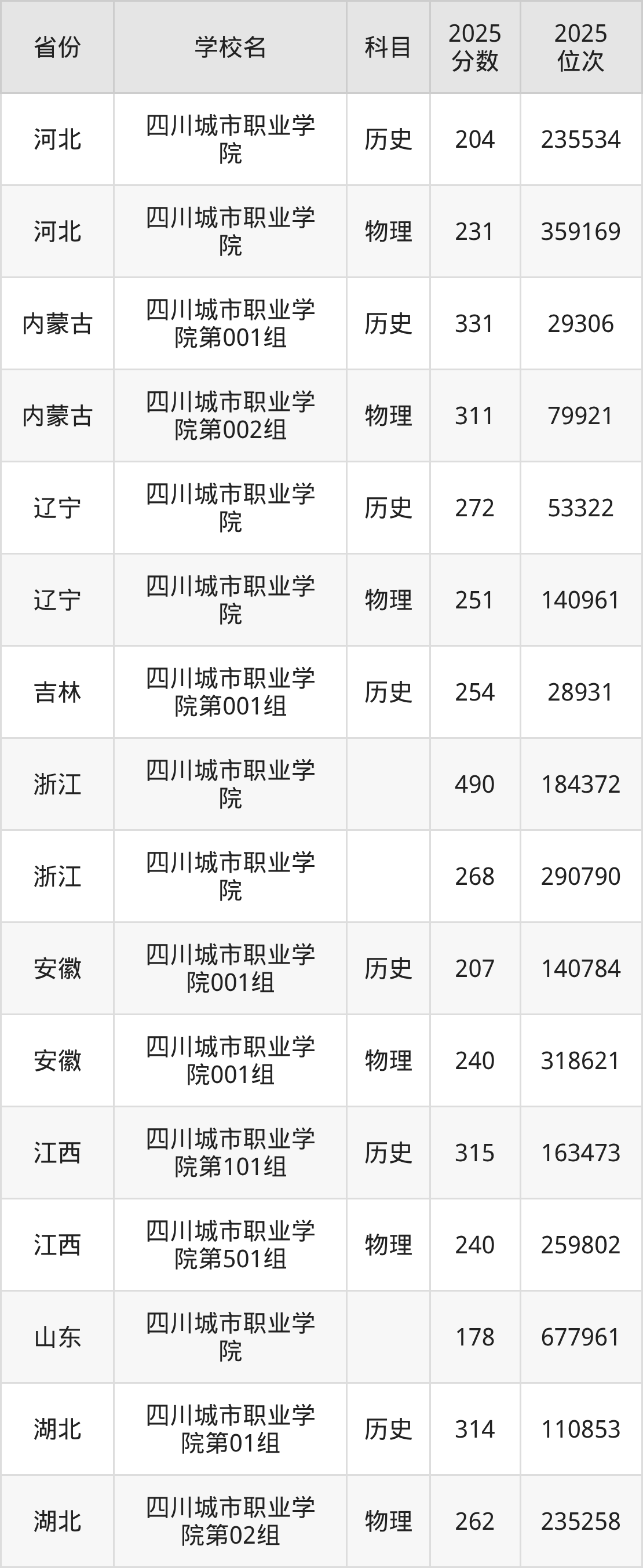 2025年四川城市职业学院在省内分历史物理科目类录取,其中历史类最低分是150分、对应位次是177978名;物理类最低分是150分,对应位次是284789名。