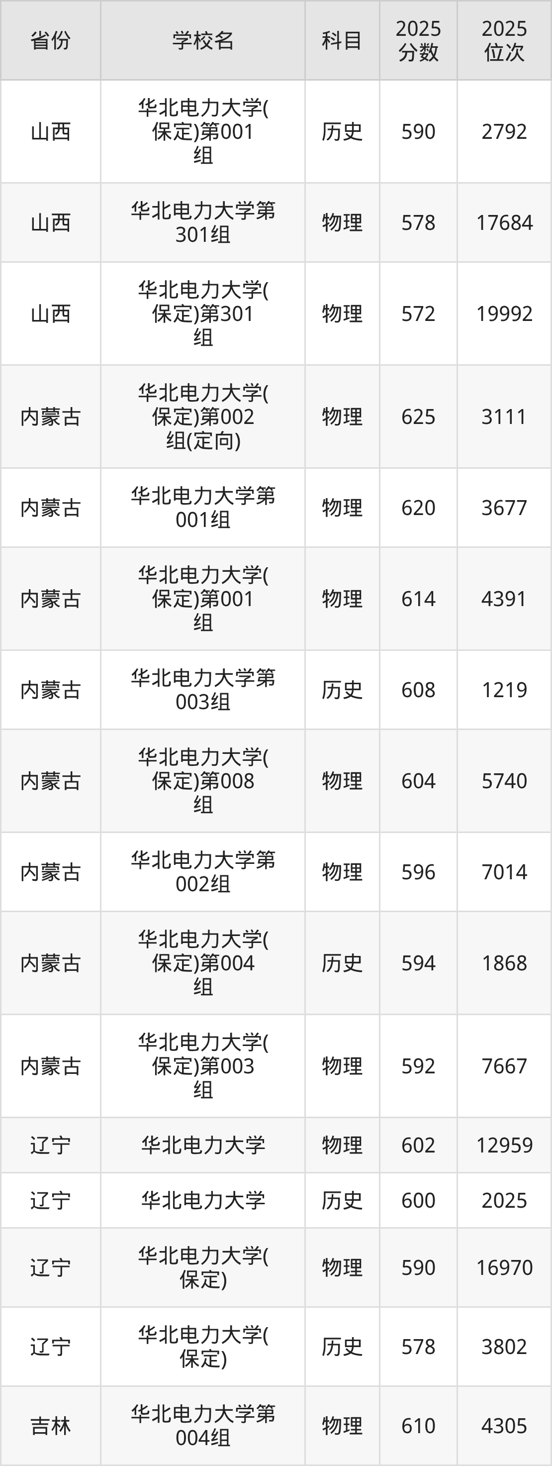 2026年华北电力大学录取分数线预计在590分及以上,在各省录取最低分存在一定差异,如:2025年华北电力大学在河北录取最低历史类608分、物理类604分,在山西录取最低历史类590分、物理类572分,在吉林录取最低历史类576分、物理类566分。