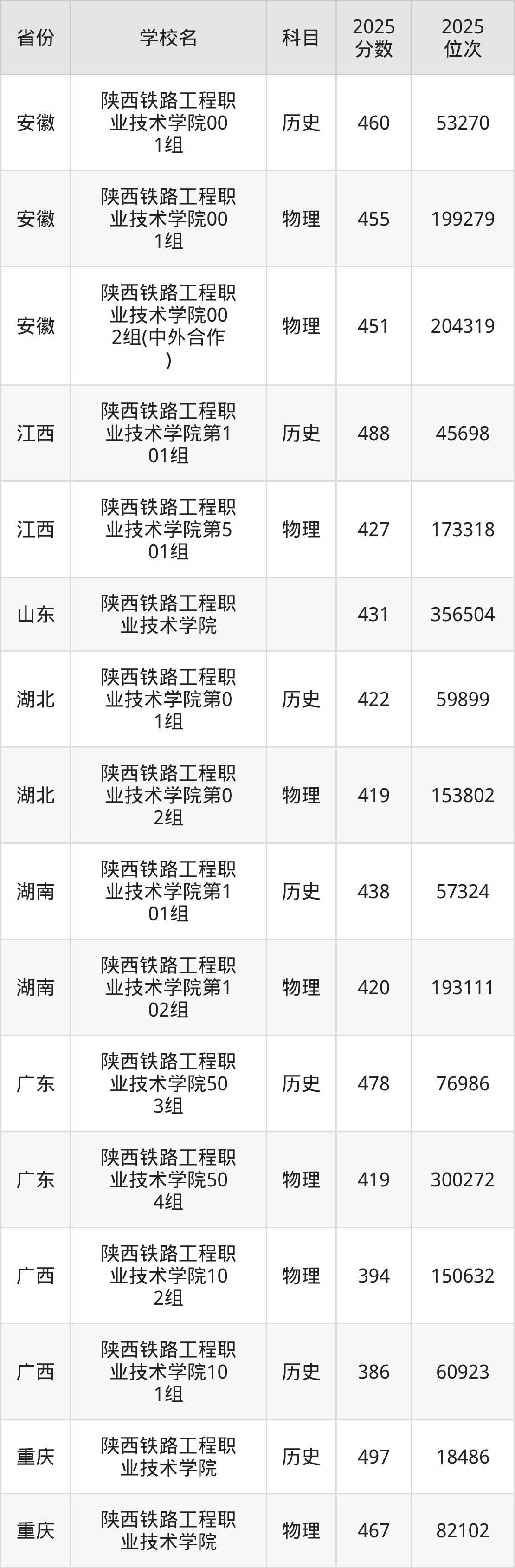 2025年陕西铁路工程职业技术学院历史类最低分470分(69602名)、物理类最低分452分(233839名)。