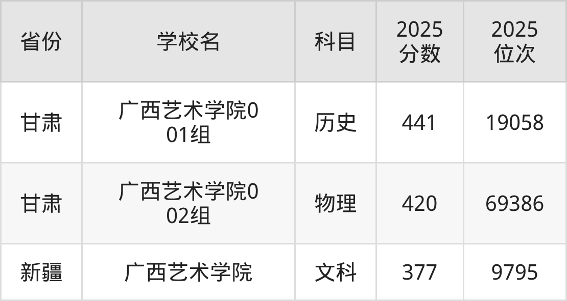 2025年广西艺术学院在壮族自治区内分历史物理科目类录取,其中历史类最低分是439分、对应位次是36603名;物理类最低分是422分,对应位次是122380名。