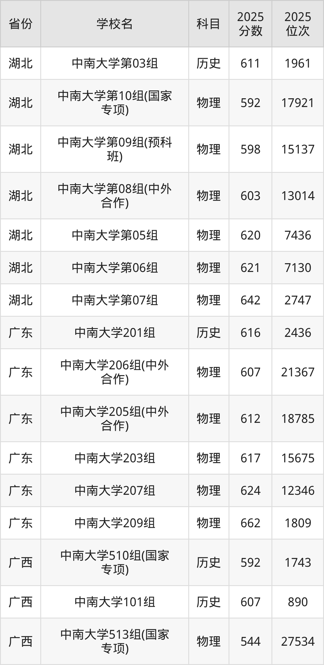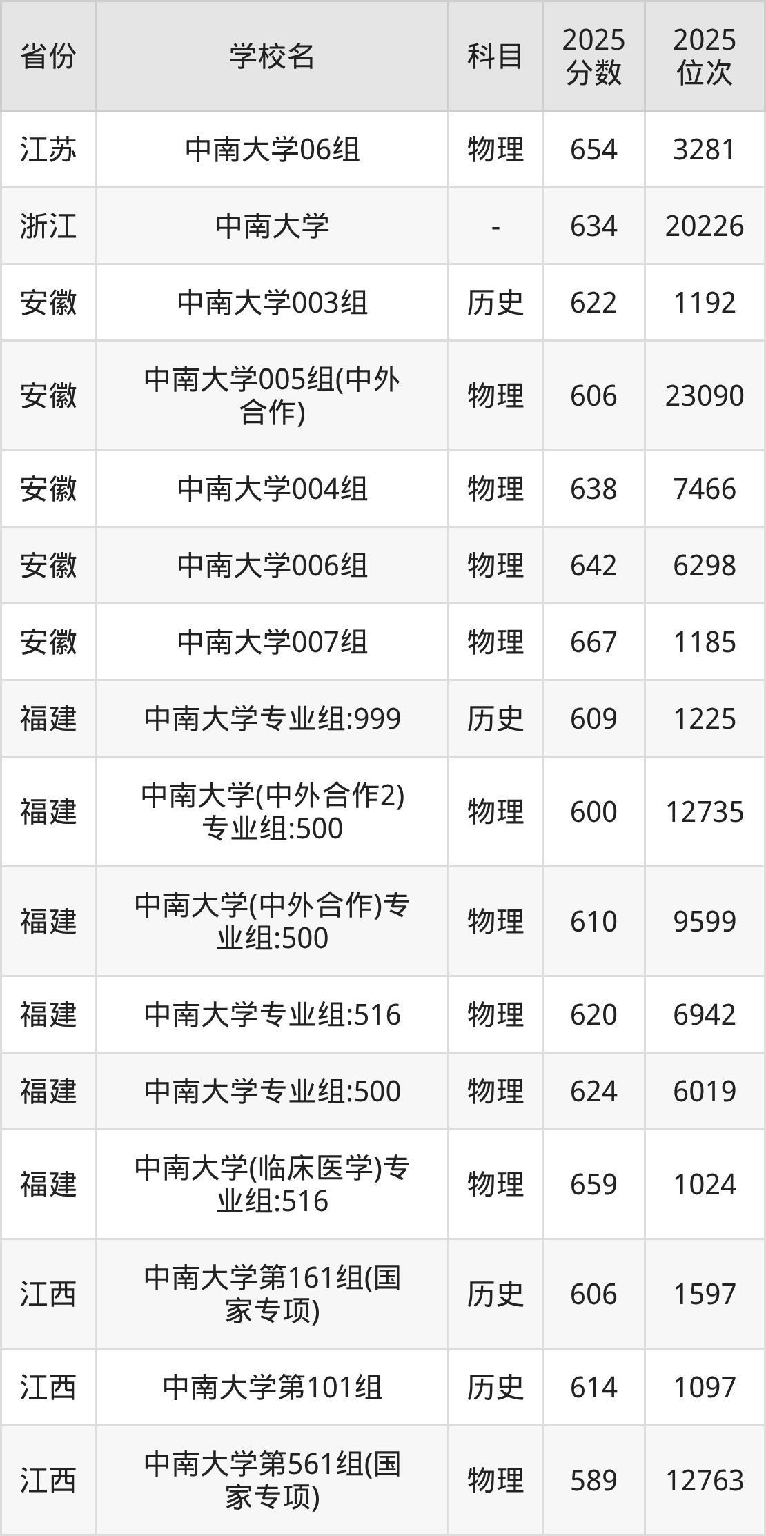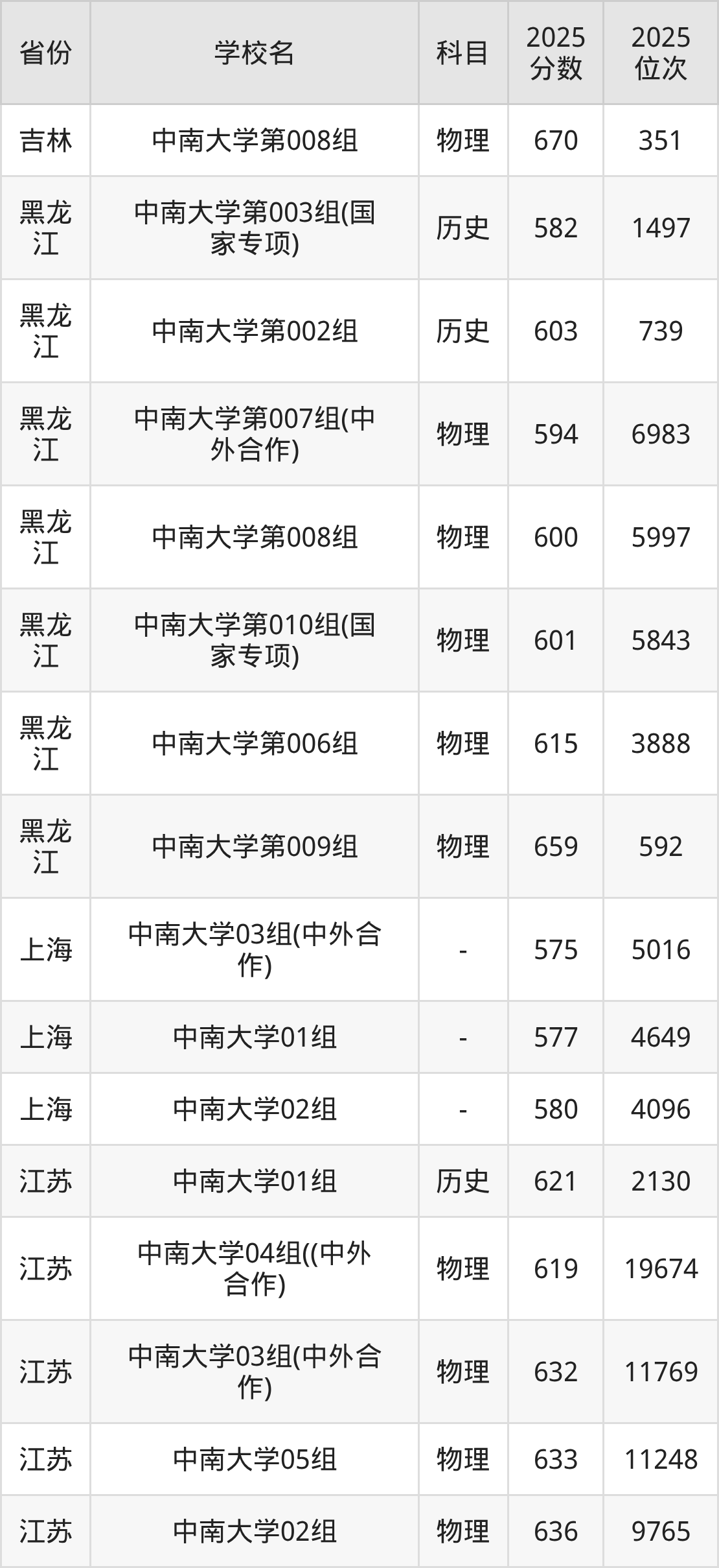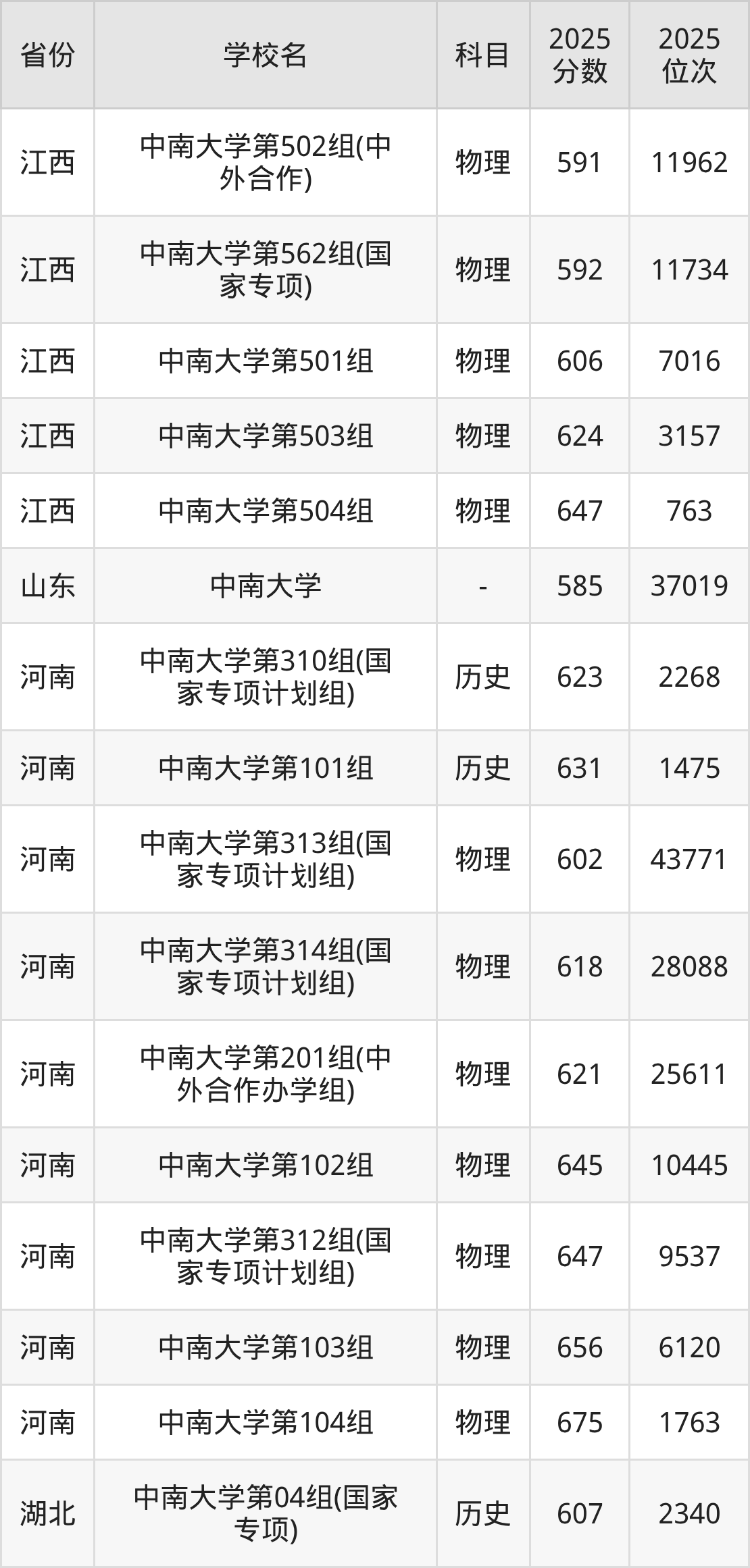 | 中南大学第32 2组(国家专项 ) | 物理 | 590 | 20503 |