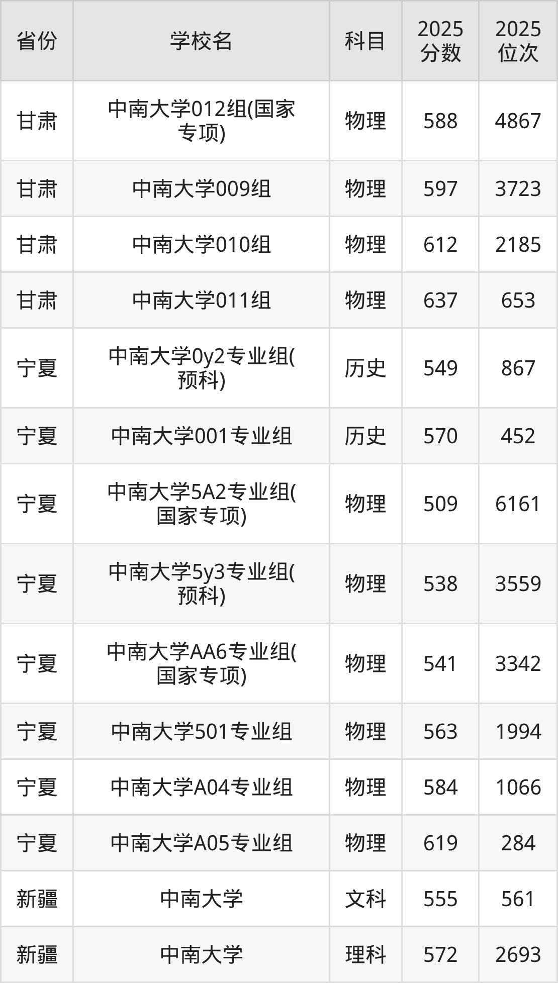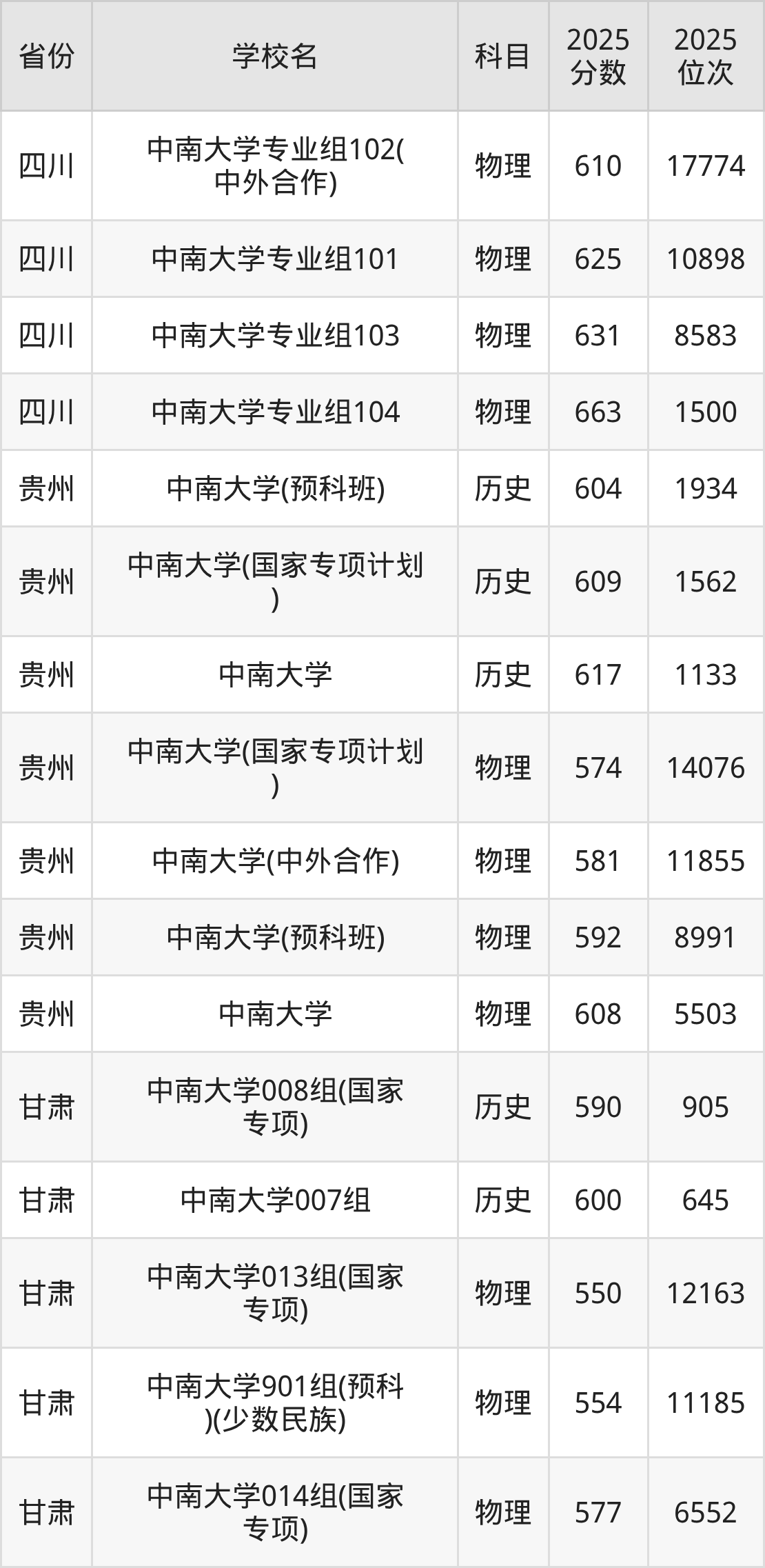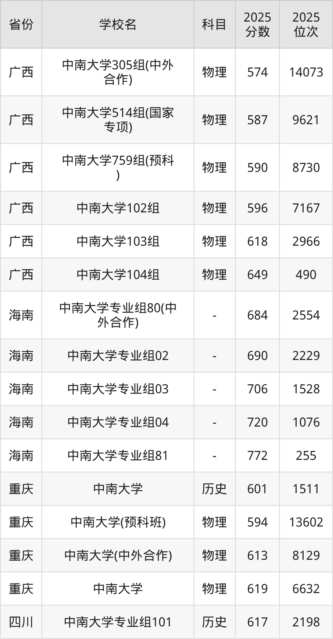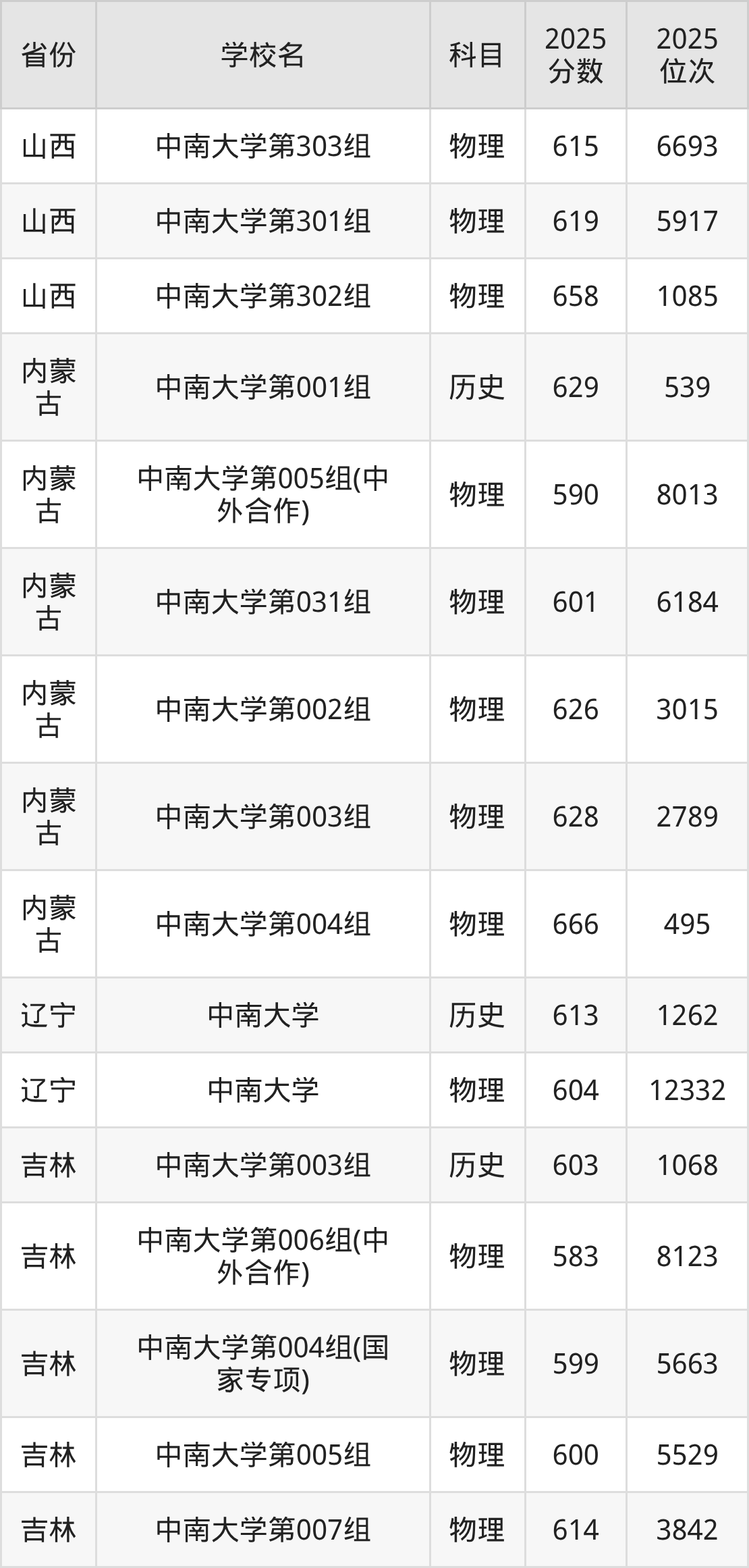 | 中南大学第32 2组(国家专项 ) | 物理 | 590 | 20503 |