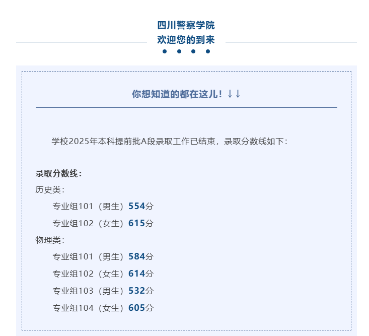 2025年四川警察学院录取分数线:历史类554分到615分、物理类532分到614分。历史类一共有两个专业组招生,分男生和女生、物理类则有4个专业组招生,各专业组最低分如下: