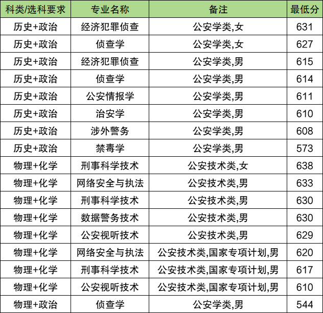 2025年中国刑事警察学院在四川录取最低分:历史类573分、物理类544分。历史组最低分专业为禁毒学、物理组则为侦查学,性别要求均为男生。女生最低分:历史类是627分、物理类是638分。具体如下表所示: