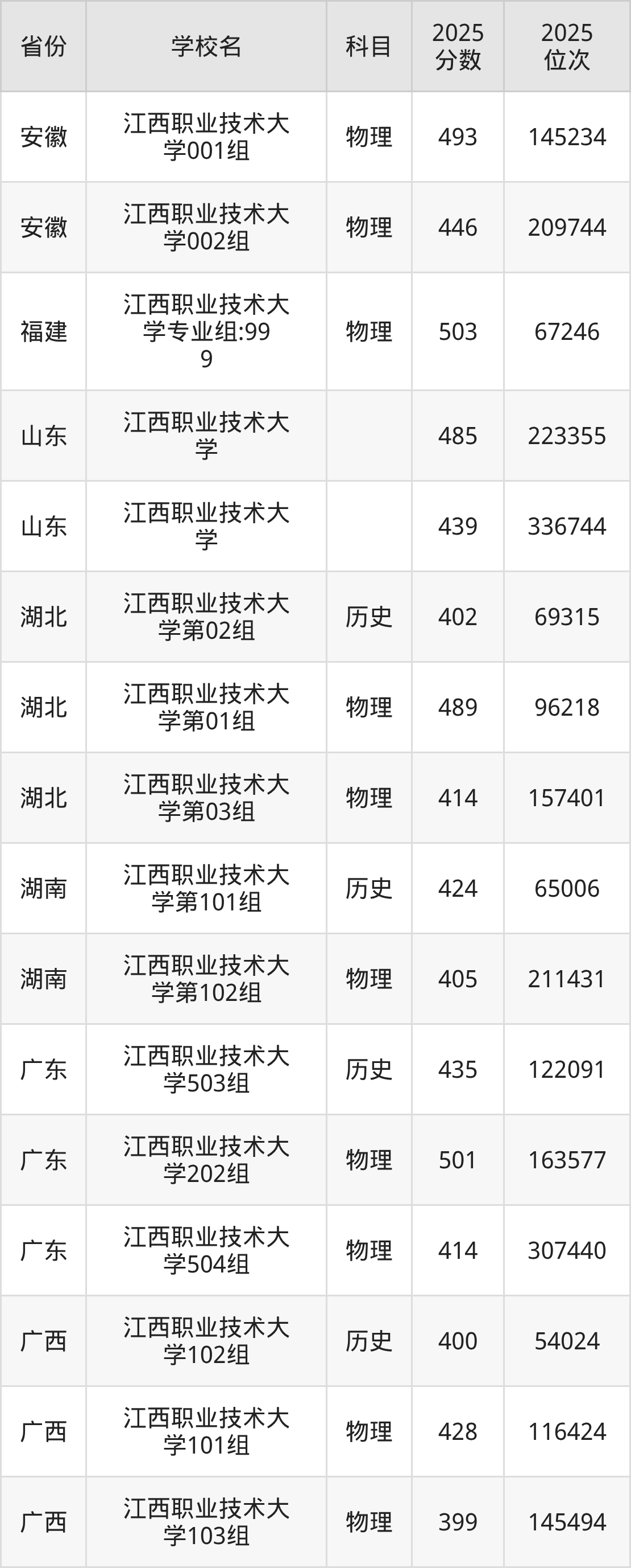 2025年江西职业技术大学历史类最低分443分(75413名)、物理类最低分390分(204240名)。