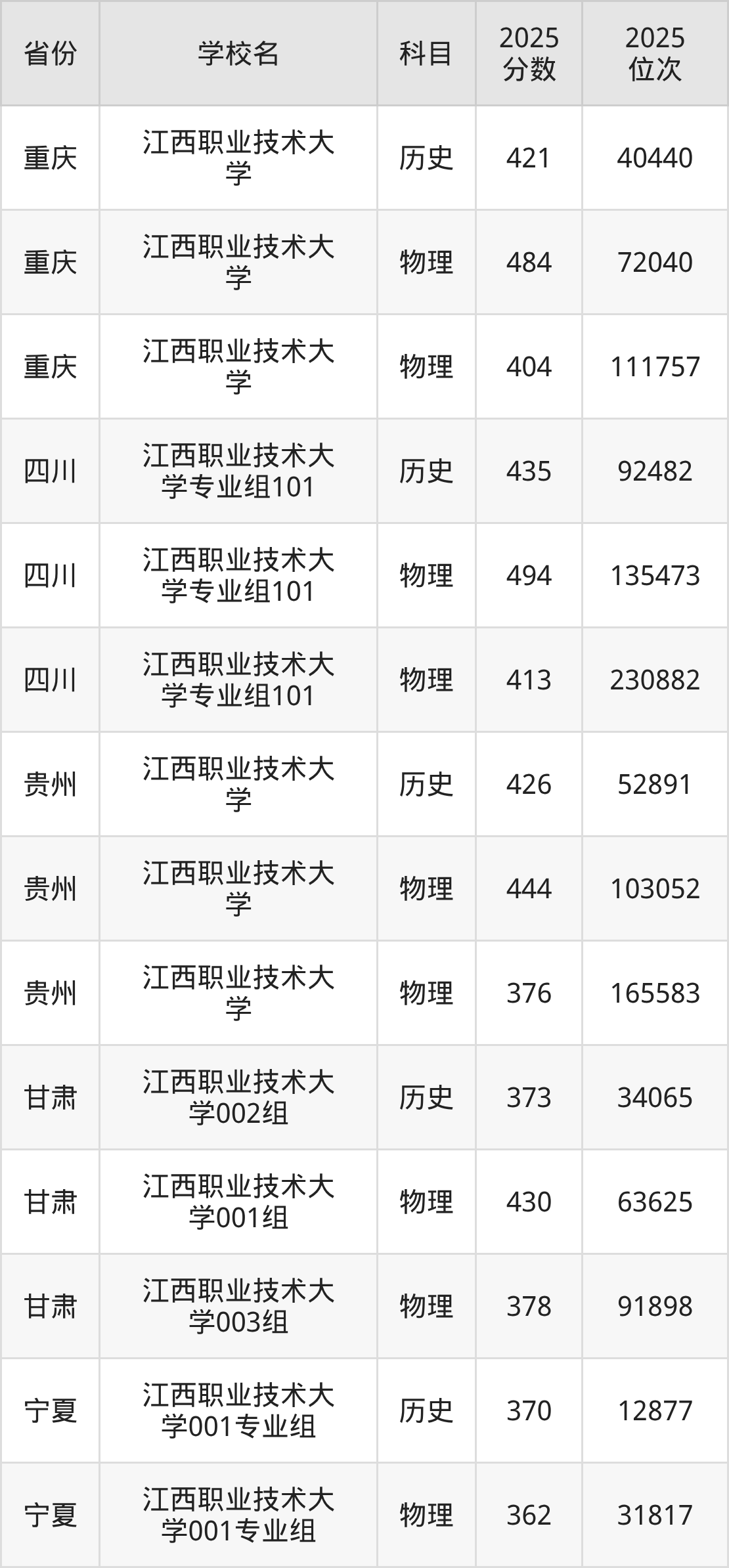 2026年江西职业技术大学录取分数线预计在420分及以上,在各省录取最低分存在一定差异,如:2025年江西职业技术大学在山西录取最低历史类396分、物理类382分,在重庆录取最低历史类421分、物理类404分,在四川录取最低历史类435分、物理类413分。