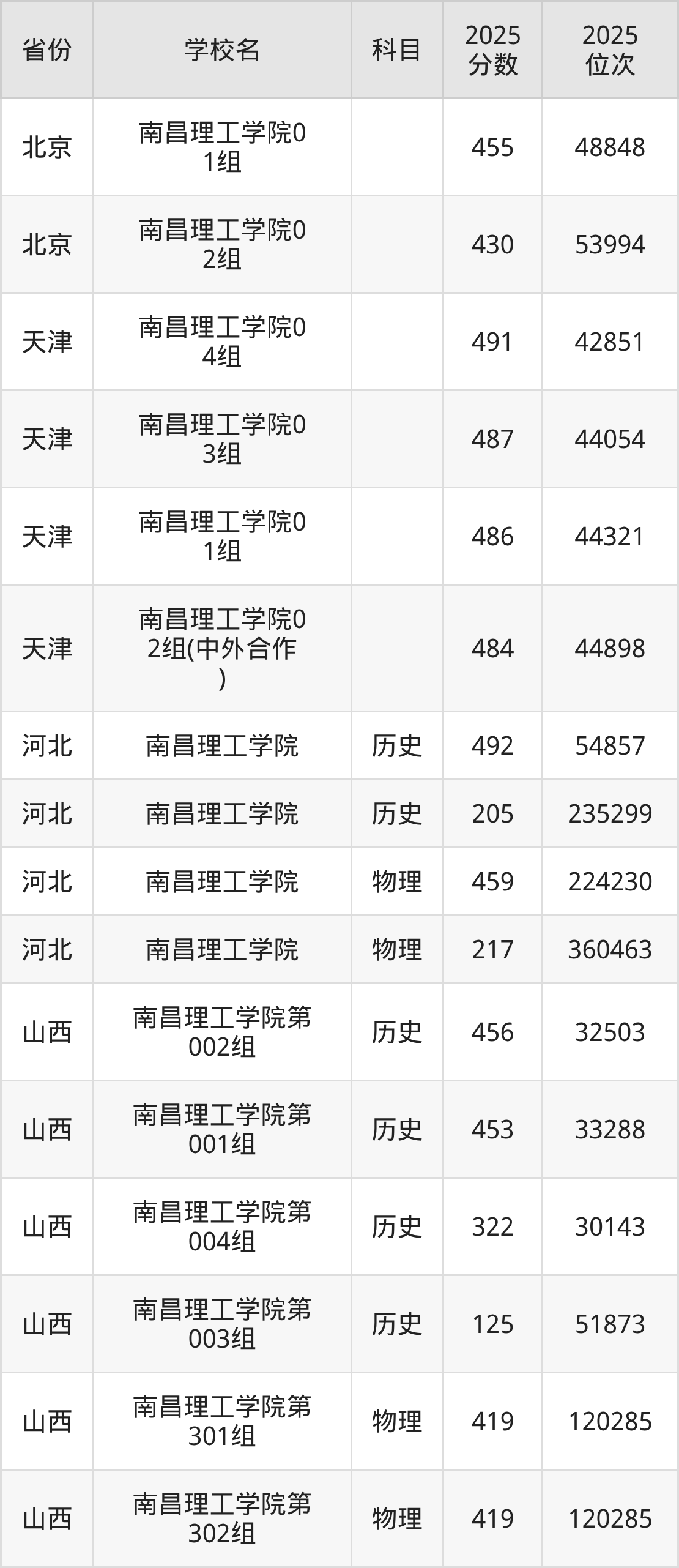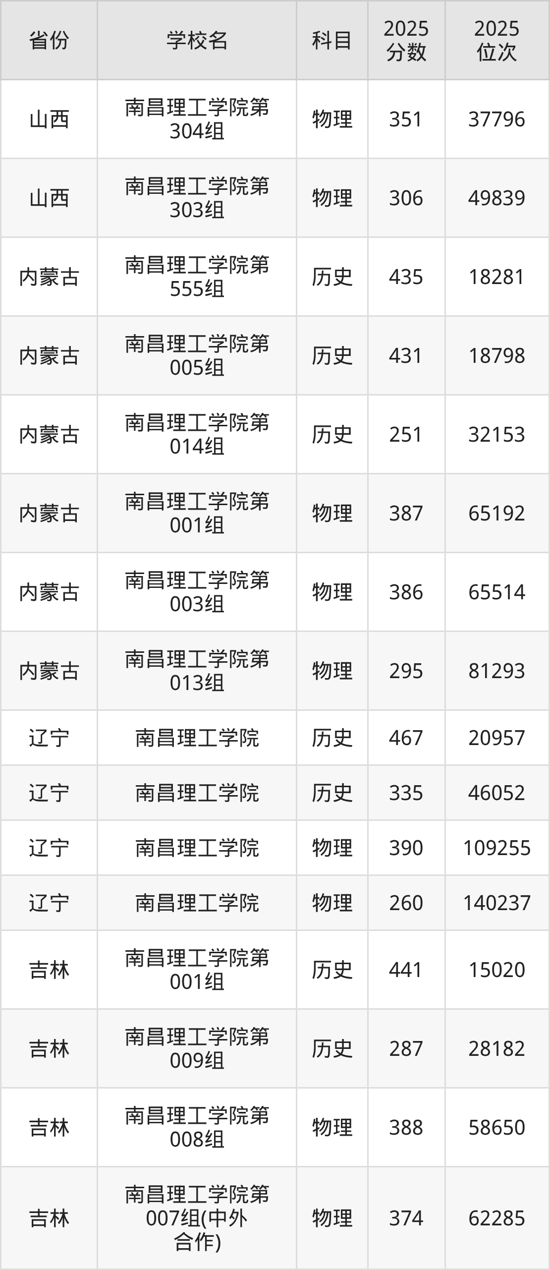 2025年南昌理工学院在省外录取分数线范围整体位于125分到544分之间,录取分数线最低在山西历史(第003组)、录取分数线最高在海南(专业组07)。