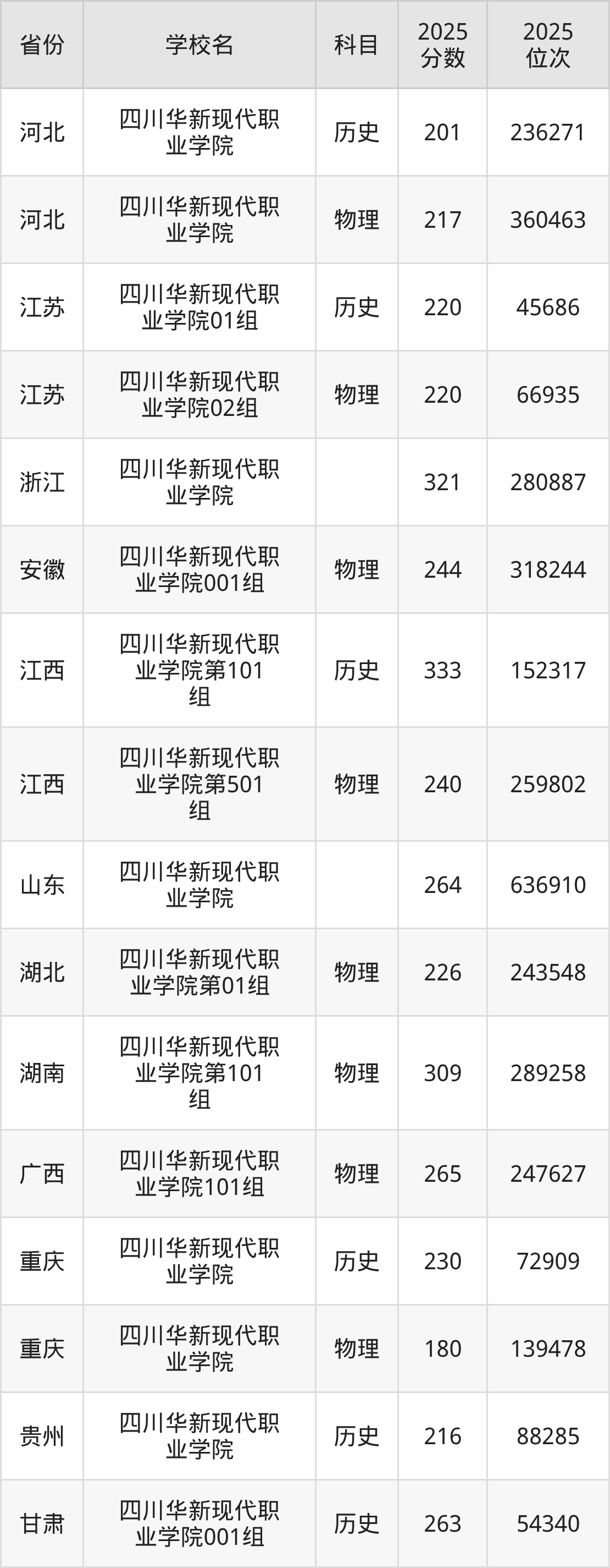 2025年四川华新现代职业学院在省内分历史物理科目类录取,其中历史类最低分是150分、对应位次是177978名;物理类最低分是150分,对应位次是284789名。