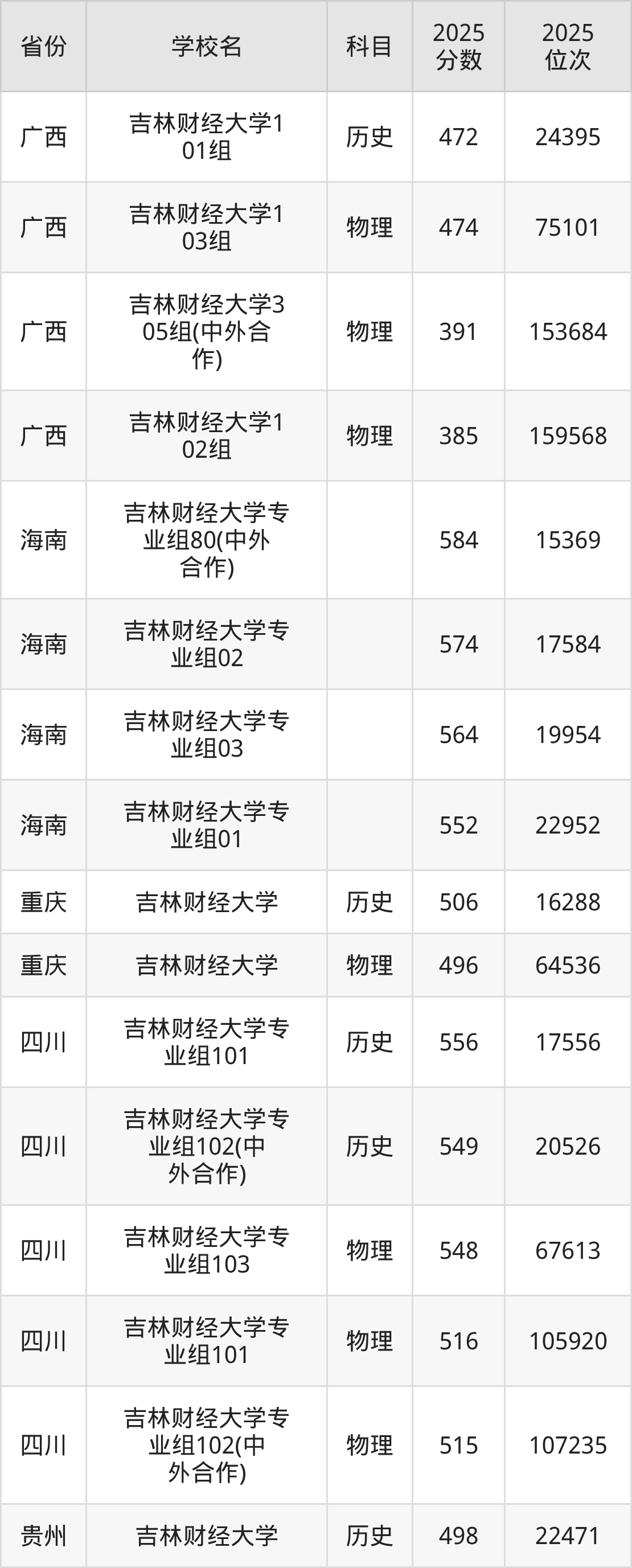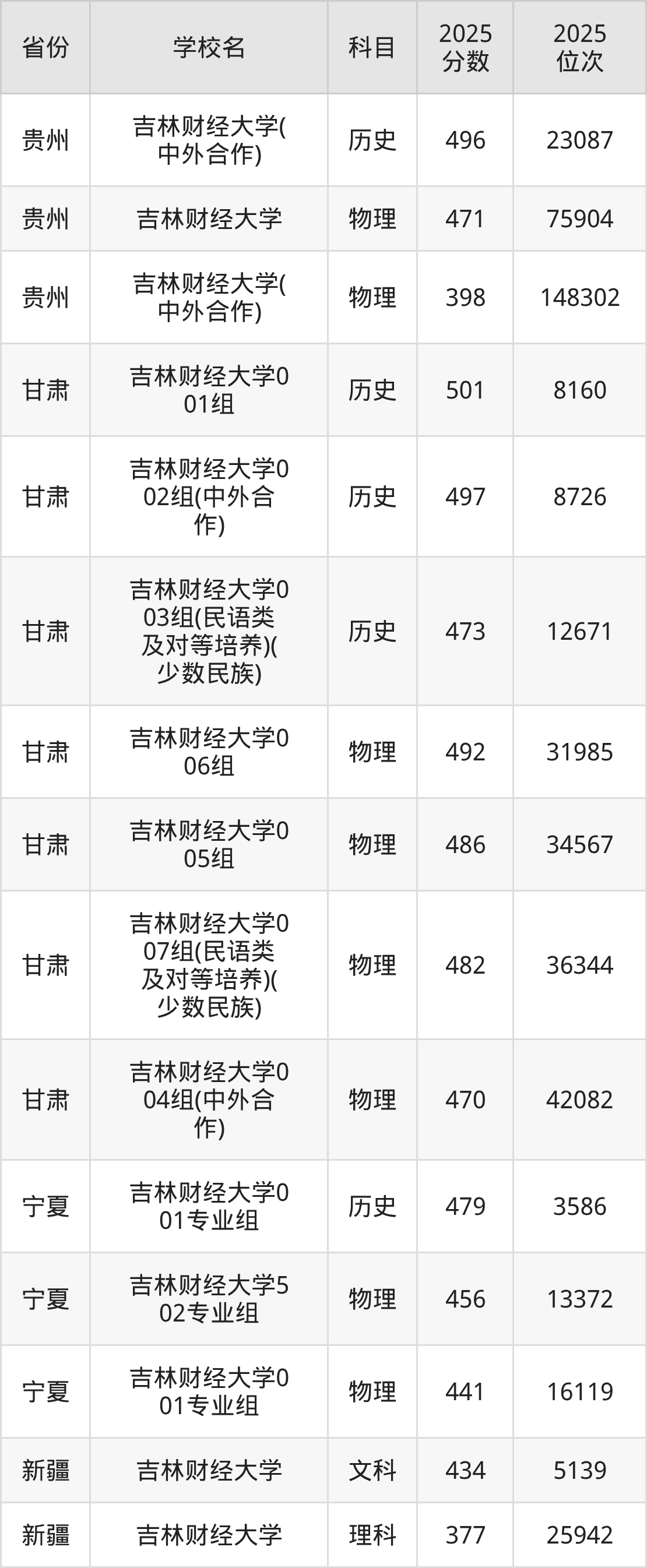 2025年吉林财经大学历史类最低分497分(8400名)、物理类最低分421分(49343名)。