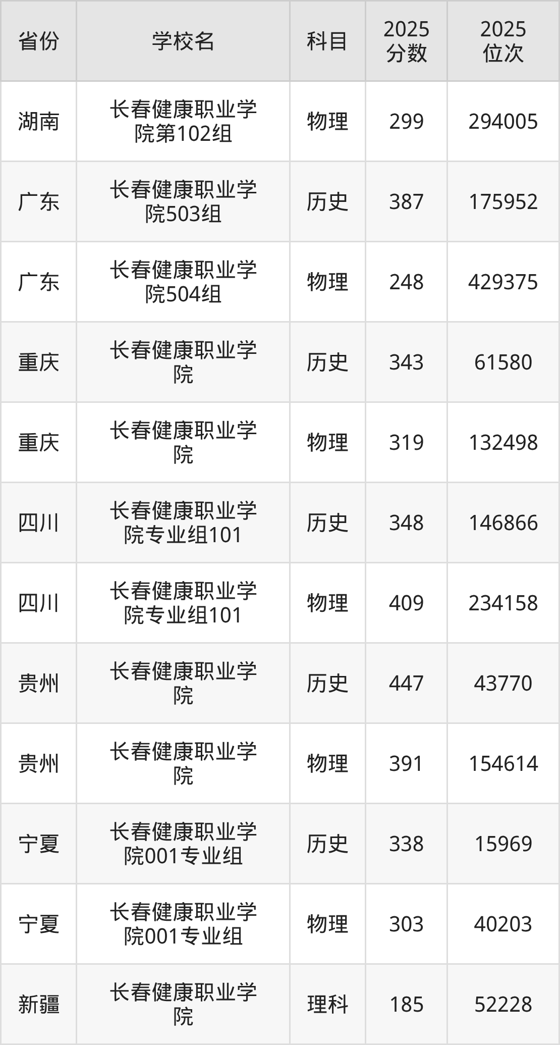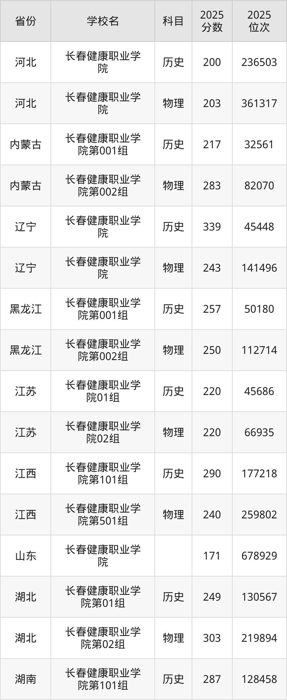2025年长春健康职业学院历史类最低分167分(29531名)、物理类最低分171分(78979名)。