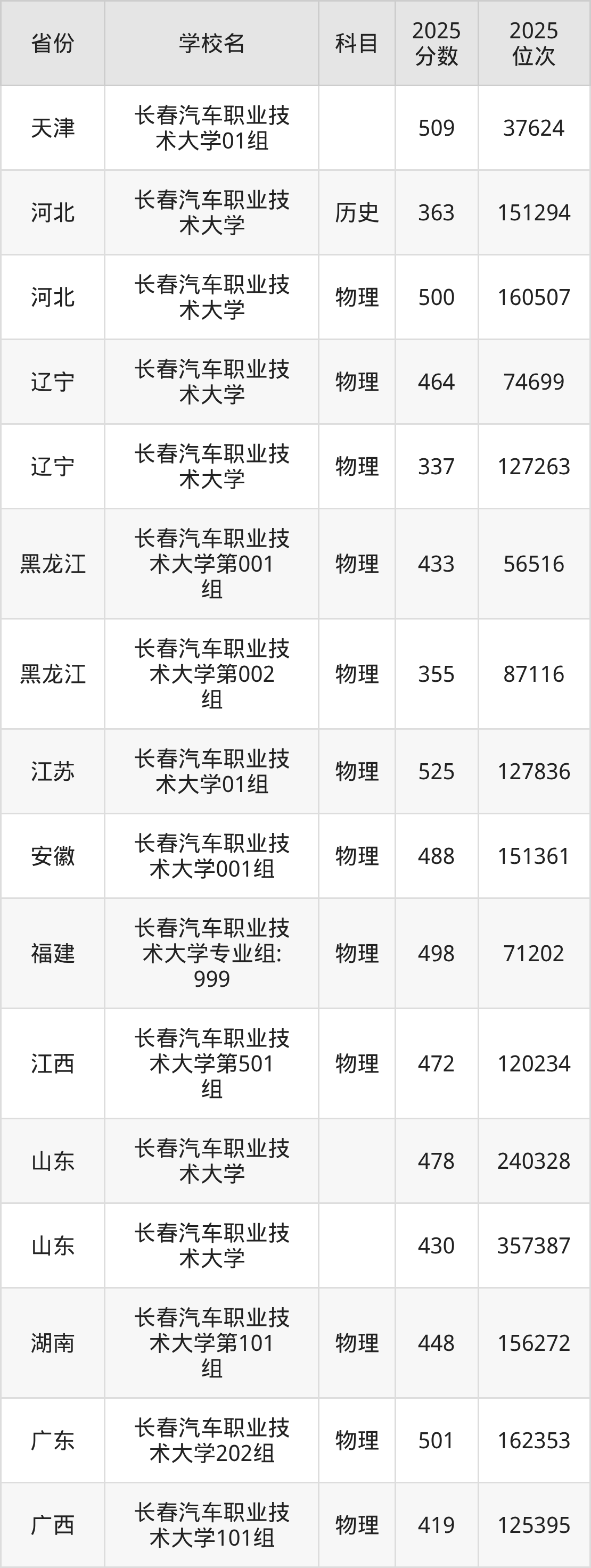 2025年长春汽车职业技术大学在省内分历史物理科目类录取,其中历史类最低分是395分、对应位次是20451名;物理类最低分是347分,对应位次是68090名。