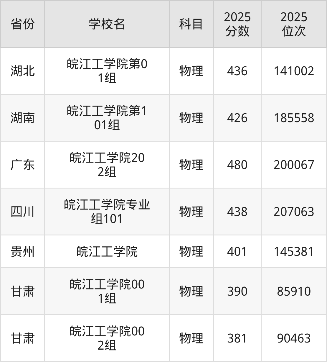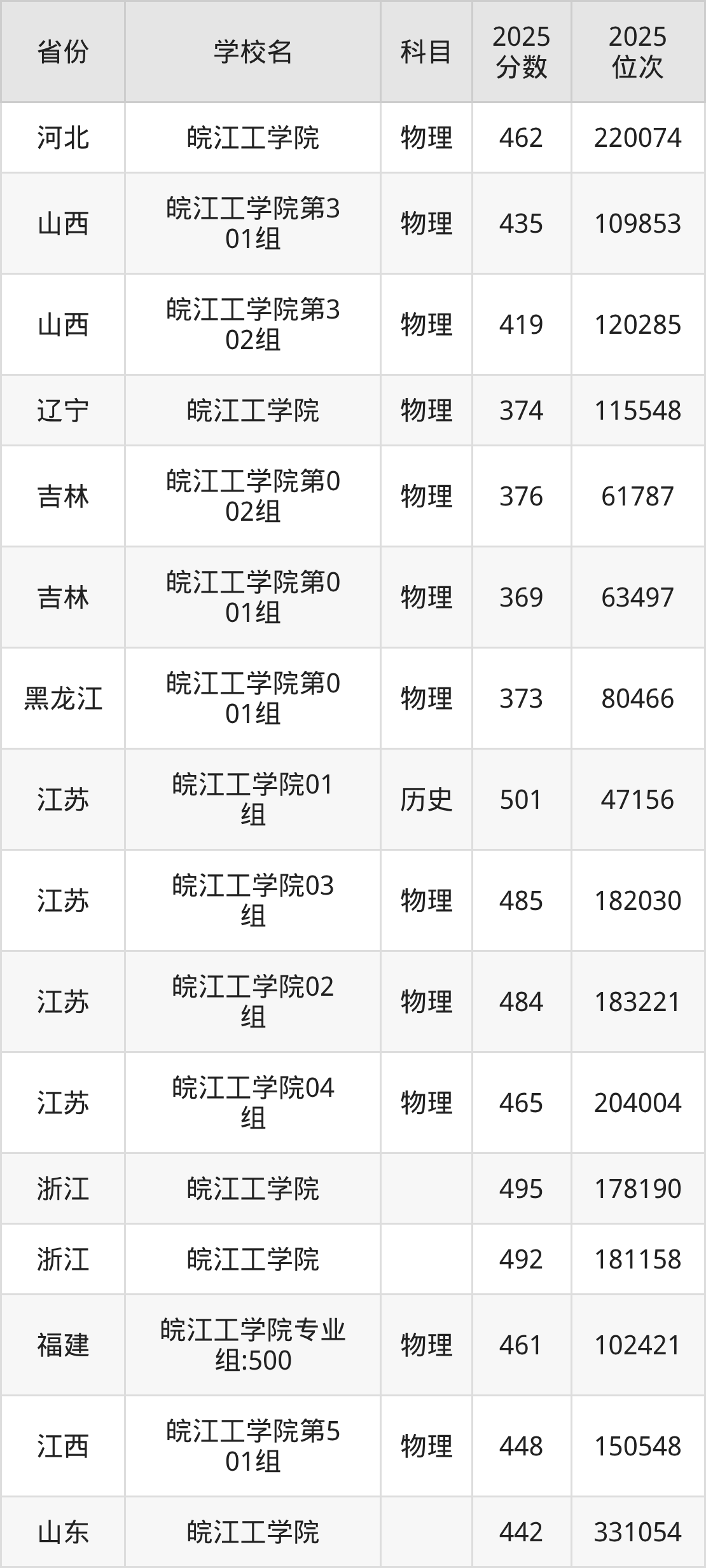 2025年皖江工学院历史类最低分485分(40263名)、物理类最低分461分(191392名)。