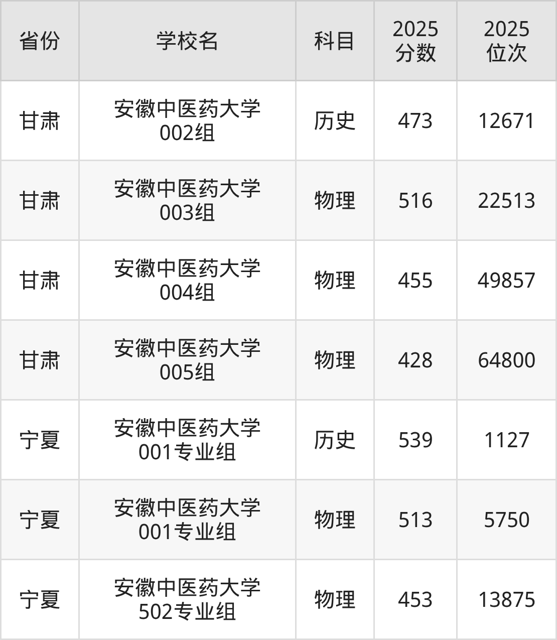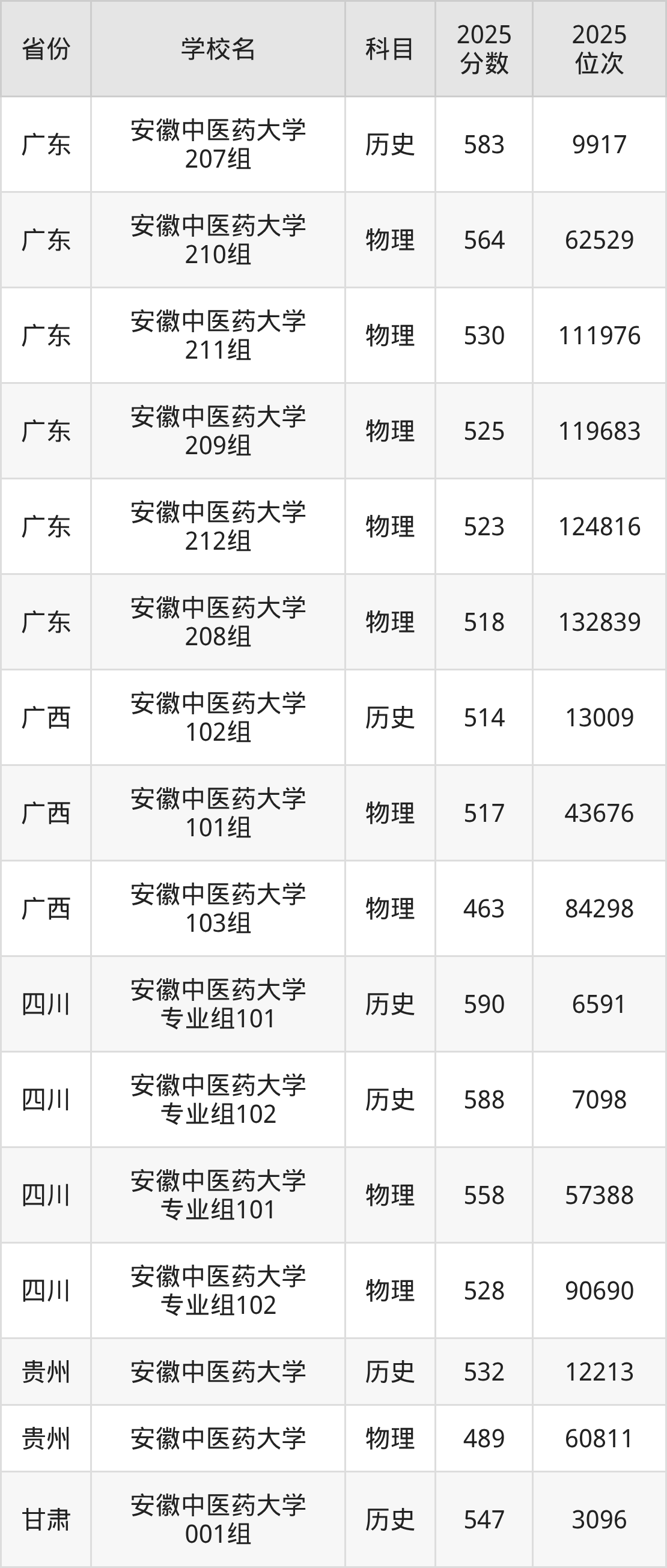 2025年安徽中医药大学在省内分历史物理科目类录取,其中历史类最低分是525分、对应位次是22362名;物理类最低分是523分,对应位次是102076名。