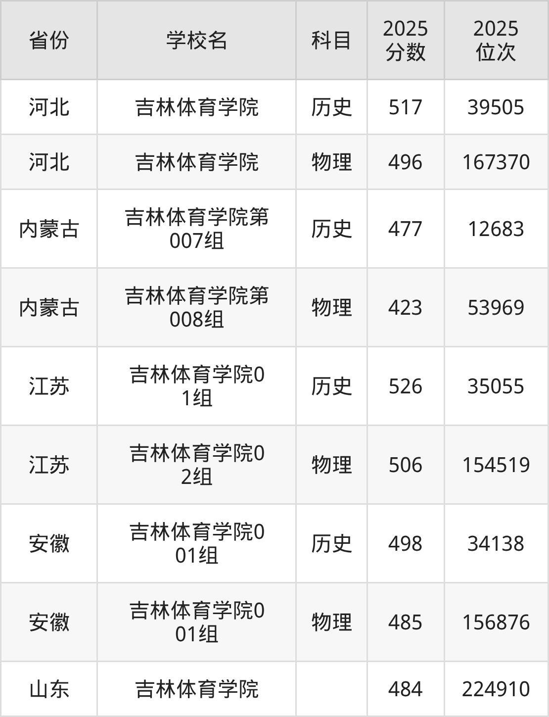2025年吉林体育学院历史类最低分469分(11614名)、物理类最低分412分(52024名)。