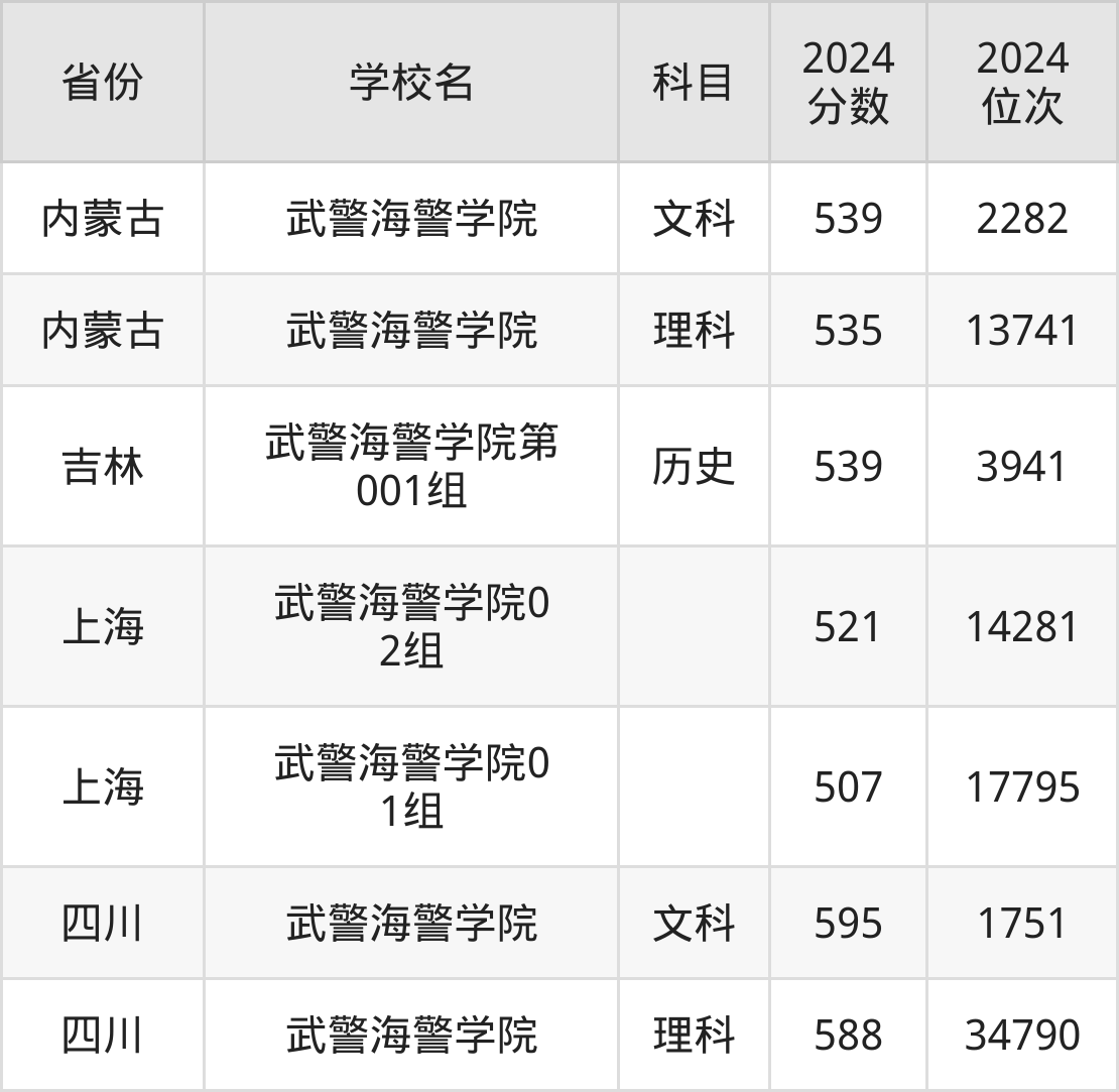 2025年武警海警学院录取分数线预计在540分及以上,在各省录取最低分存在一定差异,如:2024年武警海警学院在四川录取最低文科595分、理科588分,在内蒙古录取最低文科539分、理科535分,在吉林录取最低历史类539分。