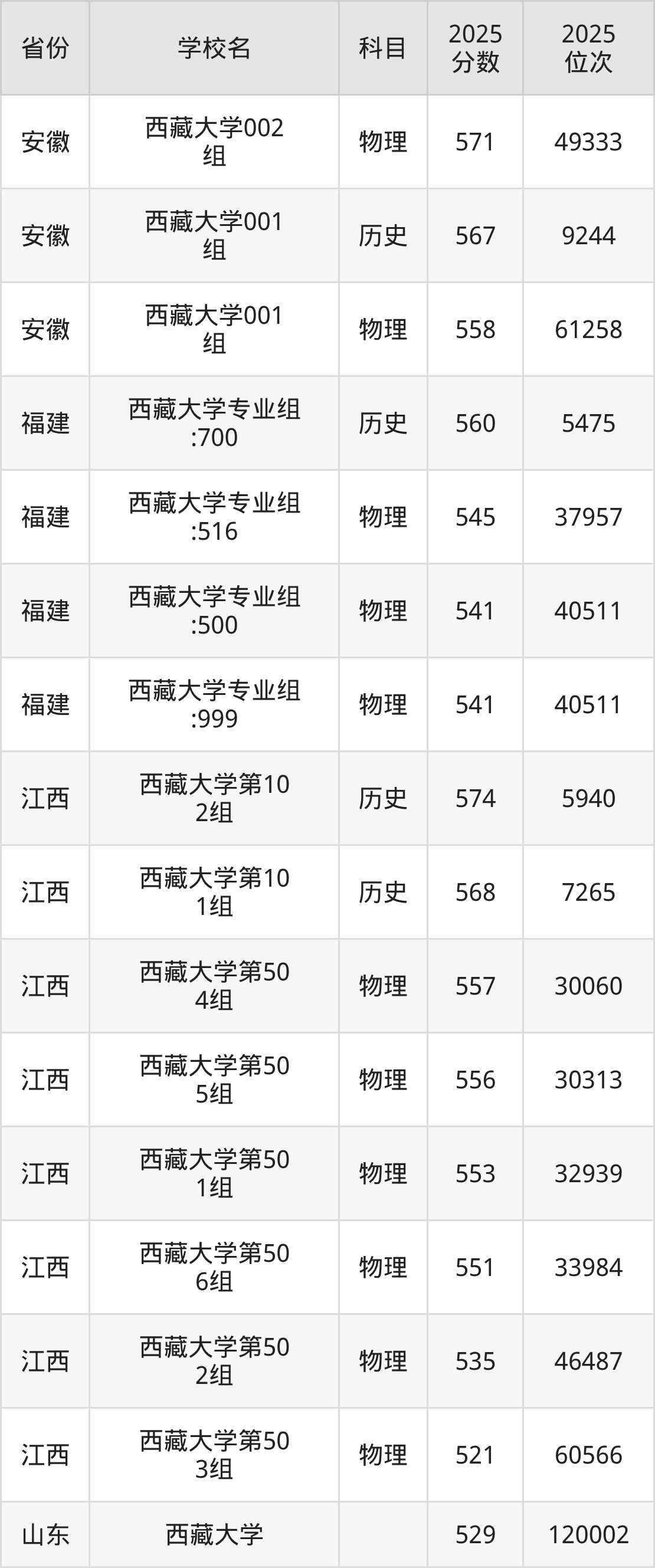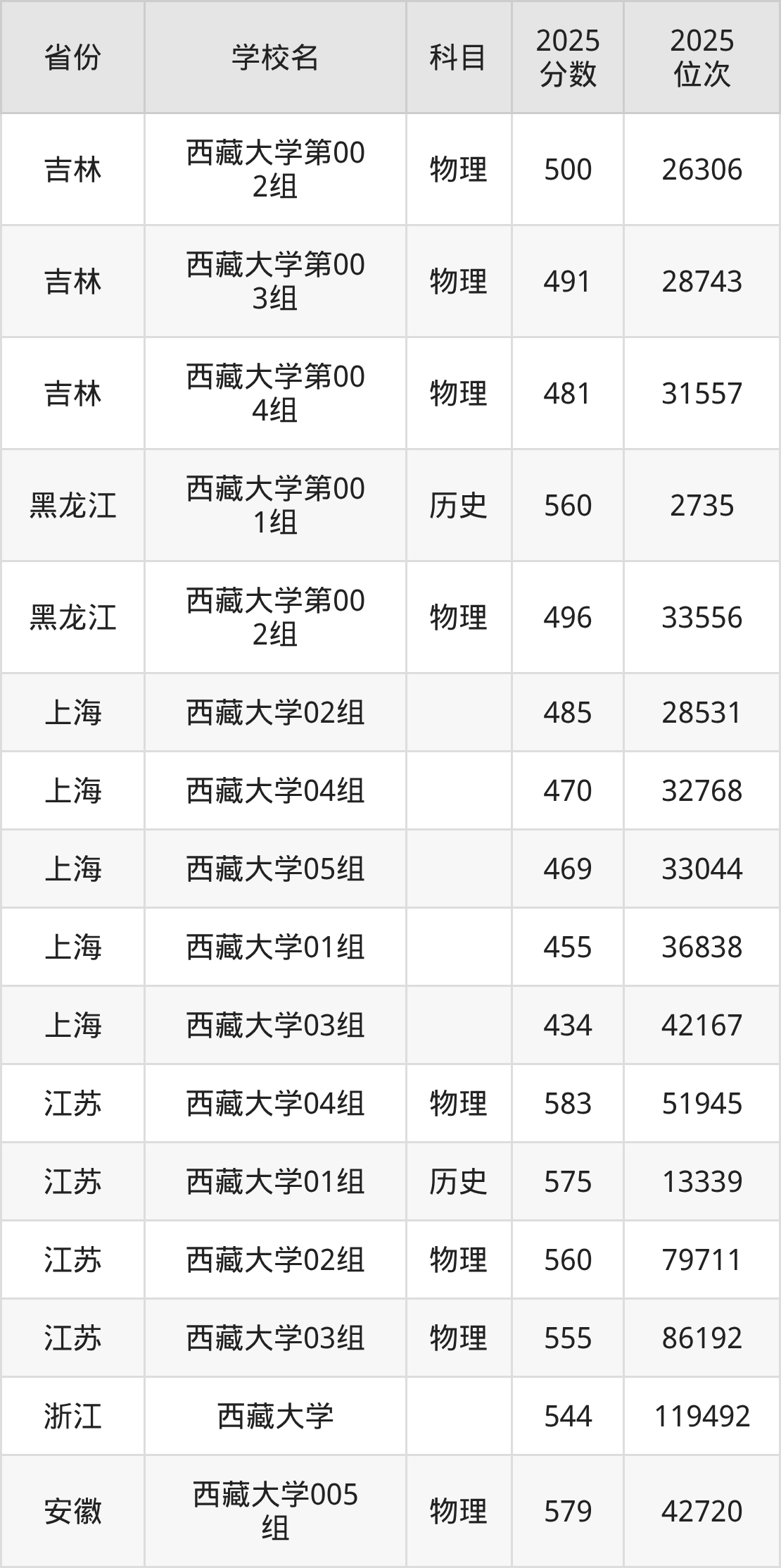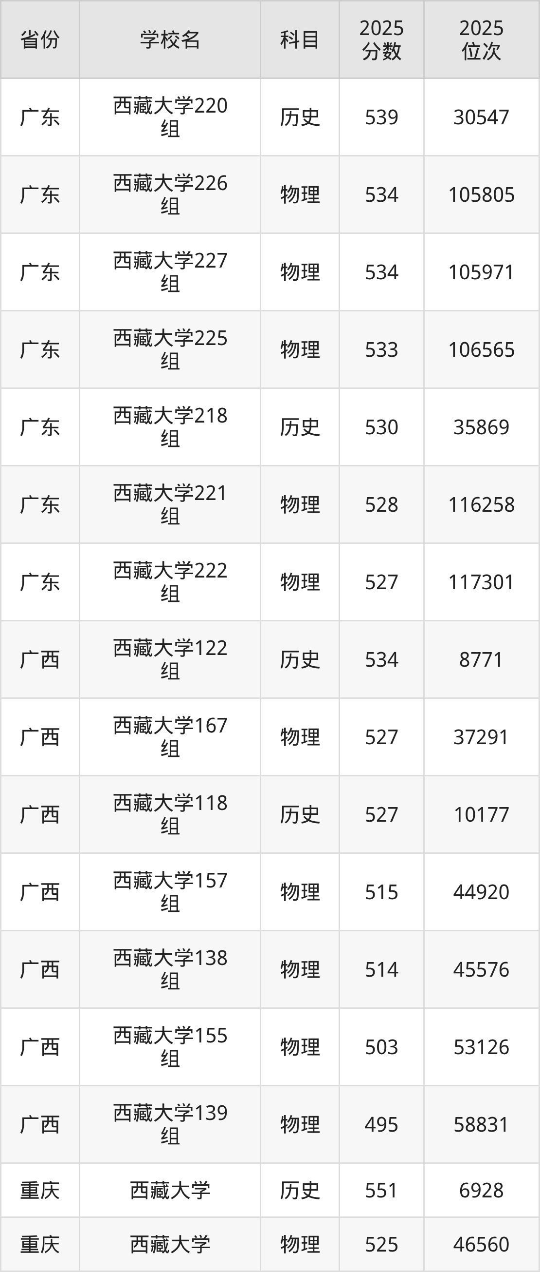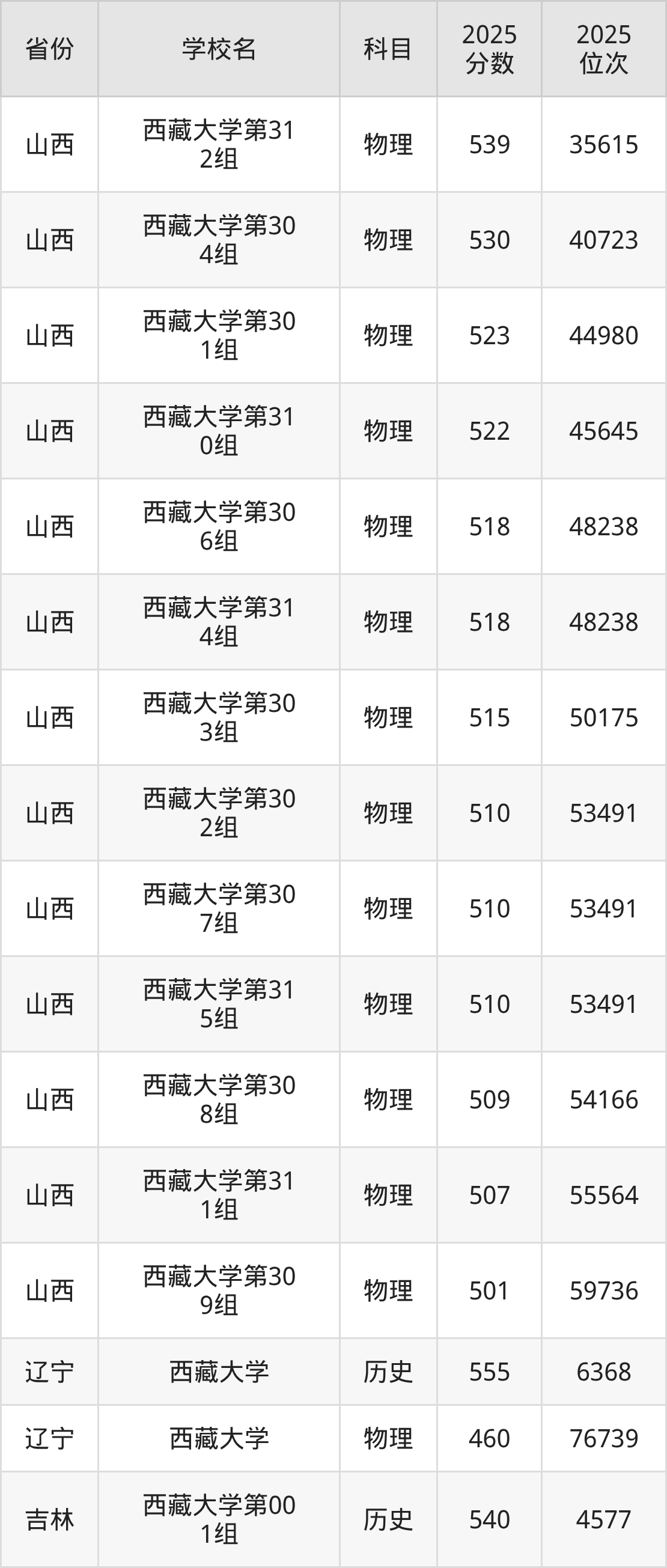 2025年西藏大学历史类最低分540分(4577名)、物理类最低分481分(31557名)。