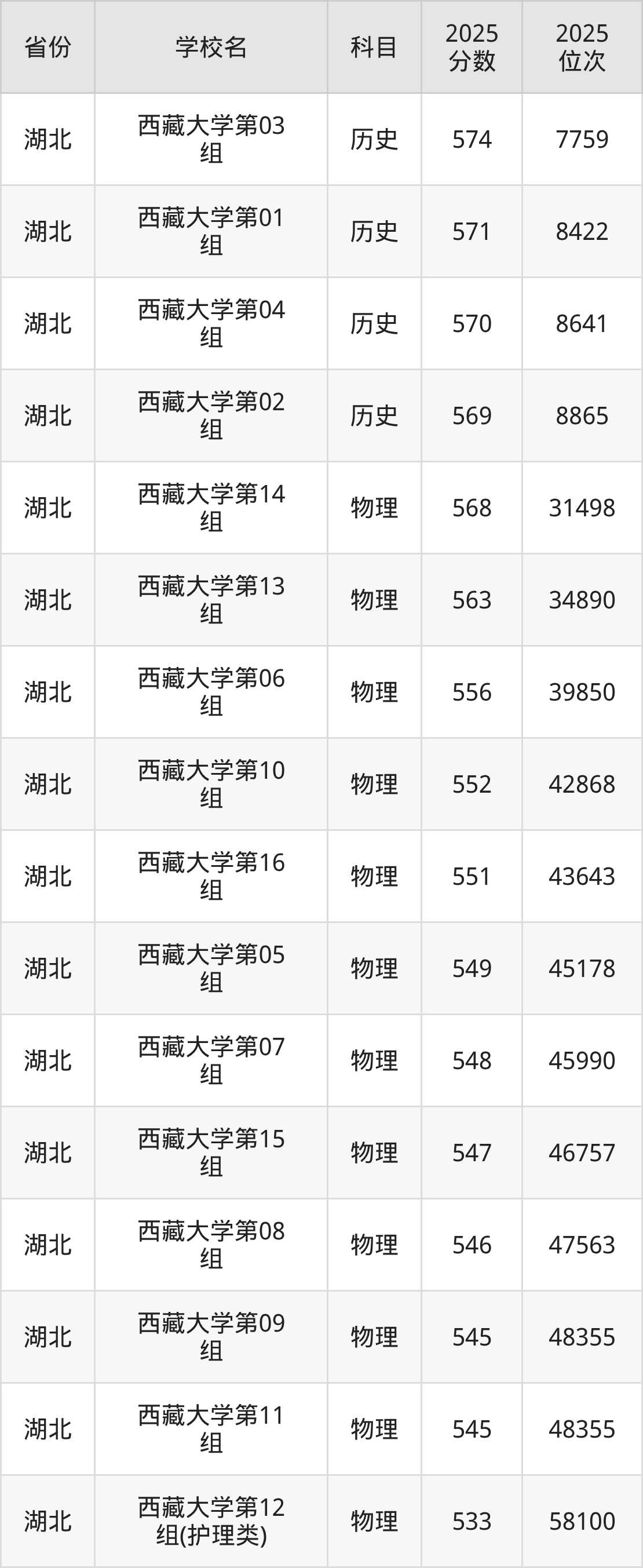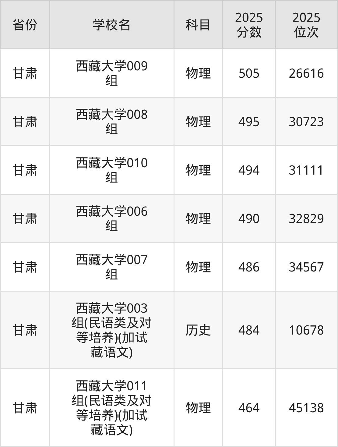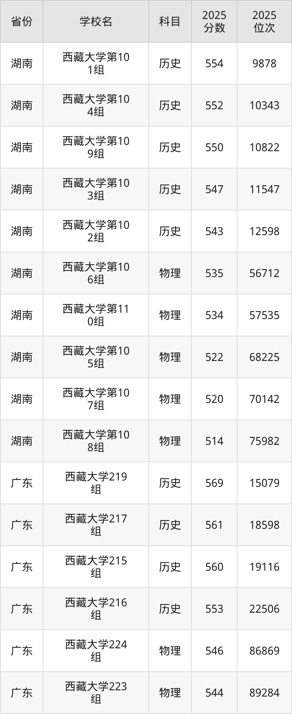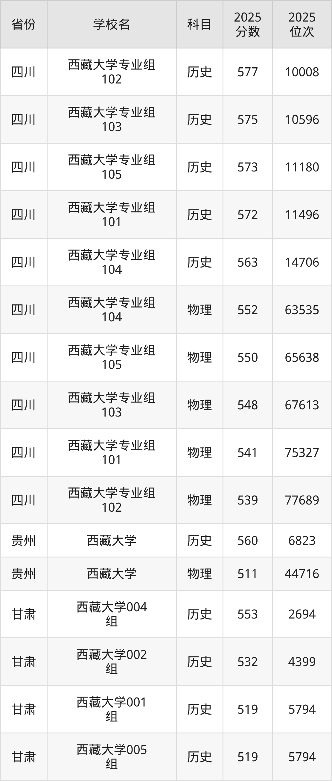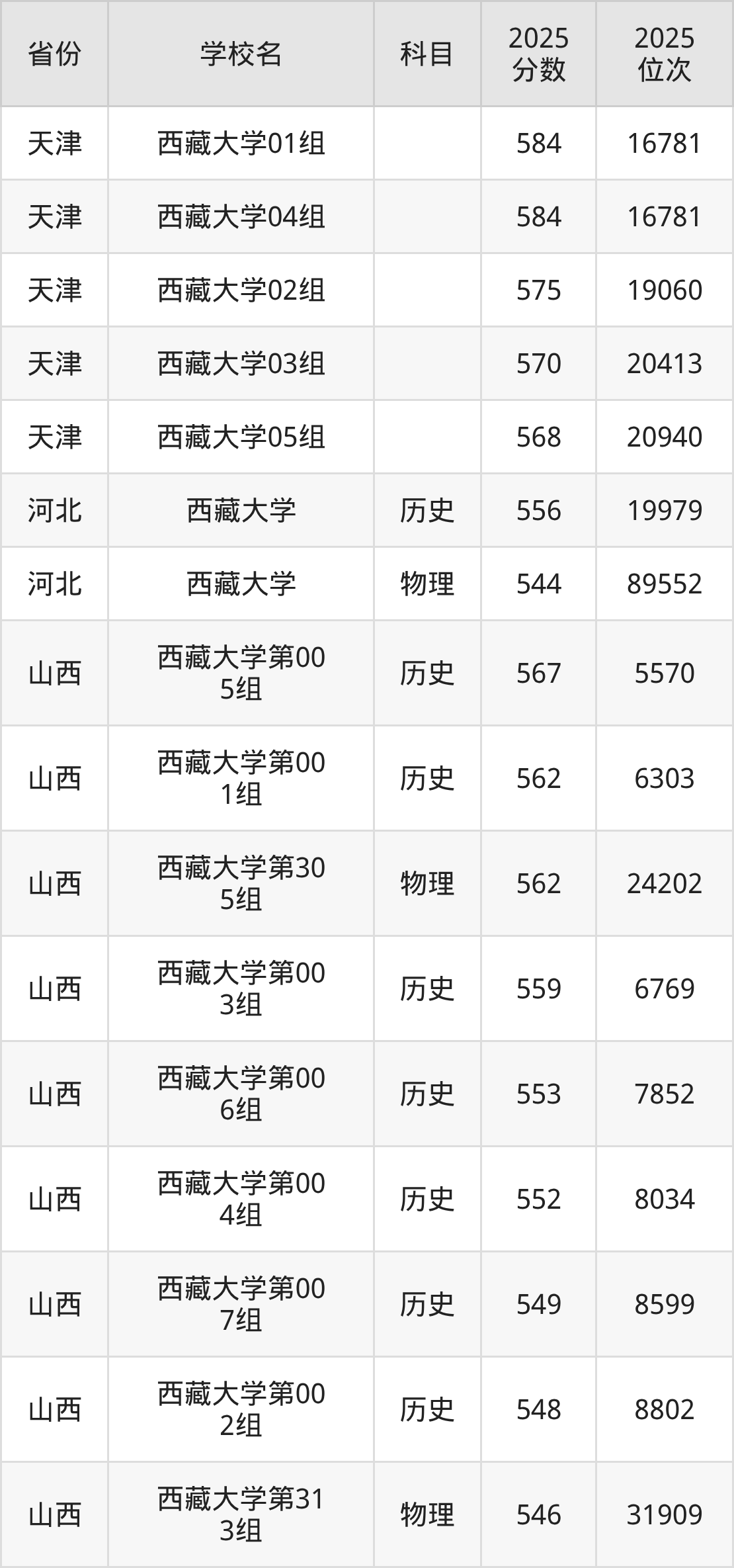 2025年西藏大学历史类最低分540分(4577名)、物理类最低分481分(31557名)。