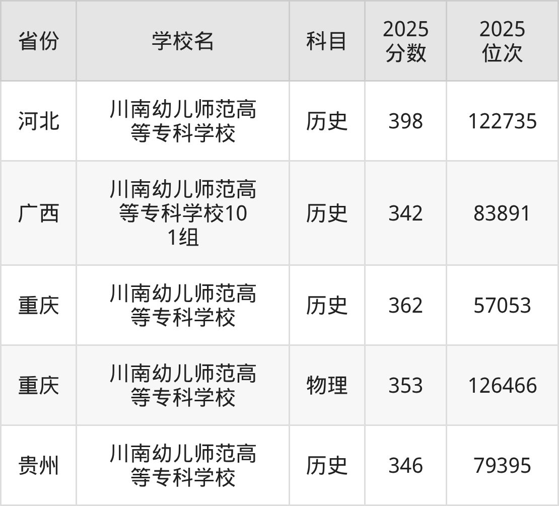 2025年川南幼儿师范高等专科学校在省内分历史物理科目类录取,其中历史类最低分是150分、对应位次是177978名;物理类最低分是150分,对应位次是284789名。