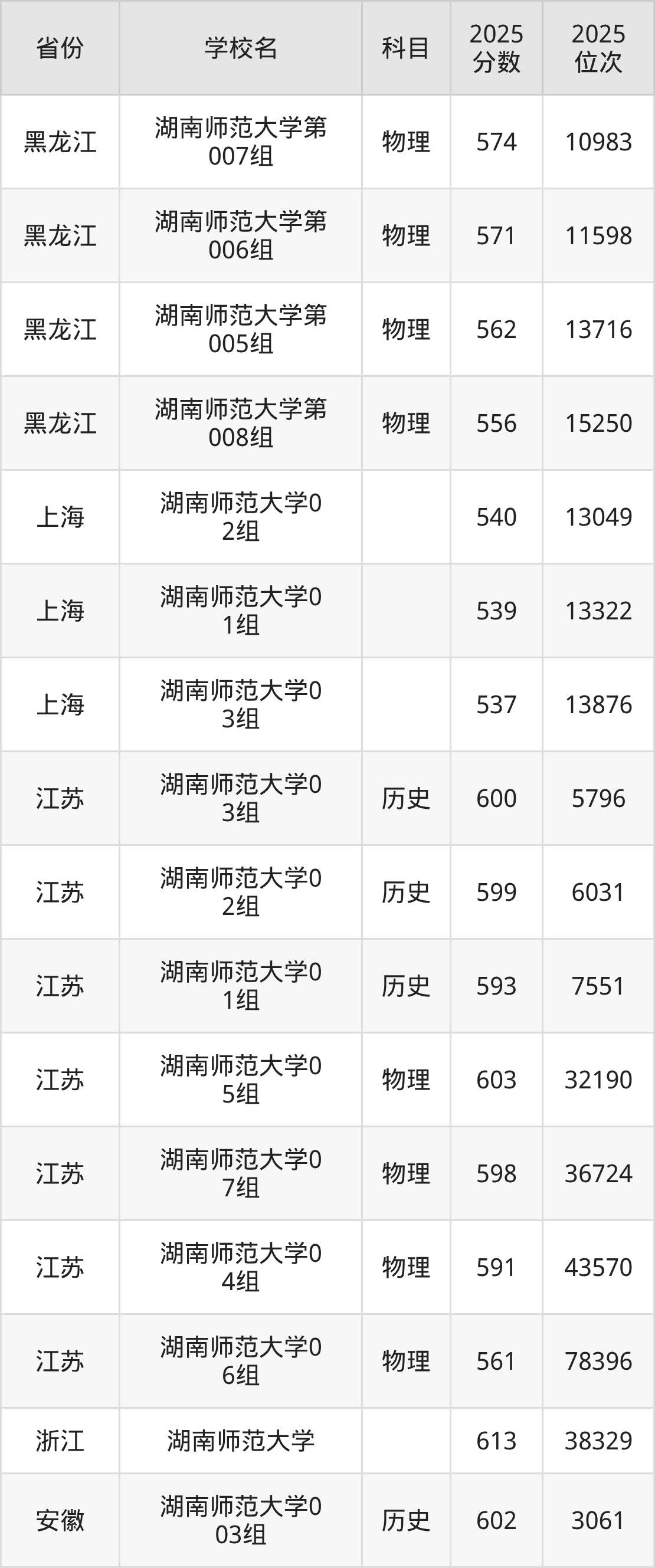 | 湖南师范大学第 361组(国家 专项) | 物理 | 582 | 24579 |