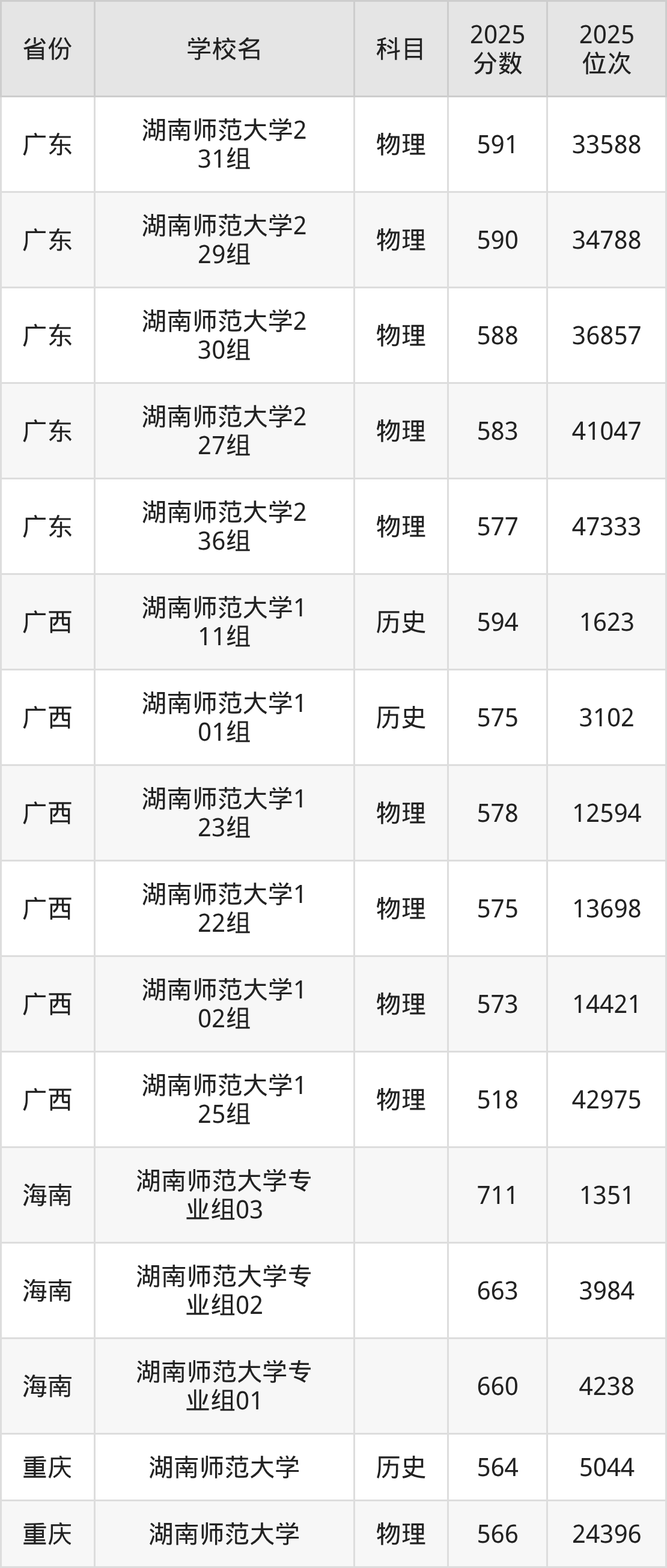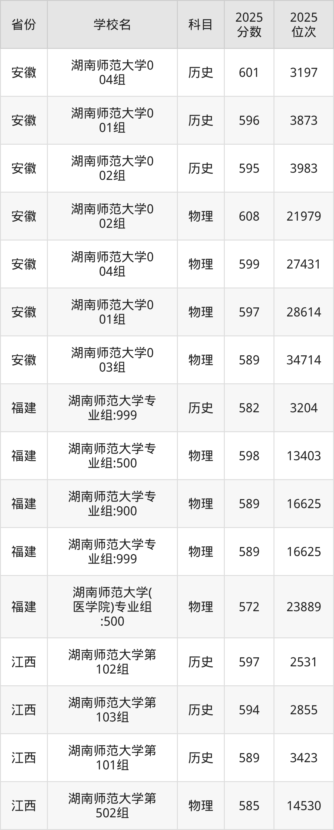 | 湖南师范大学第 365组(国家 专项) | 物理 | 581 | 25122 |