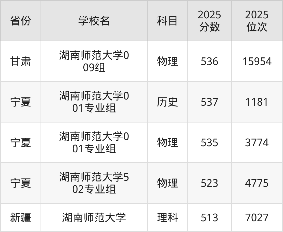 2025年湖南师范大学历史类最低分512分(22347名)、物理类最低分502分(88548名)。