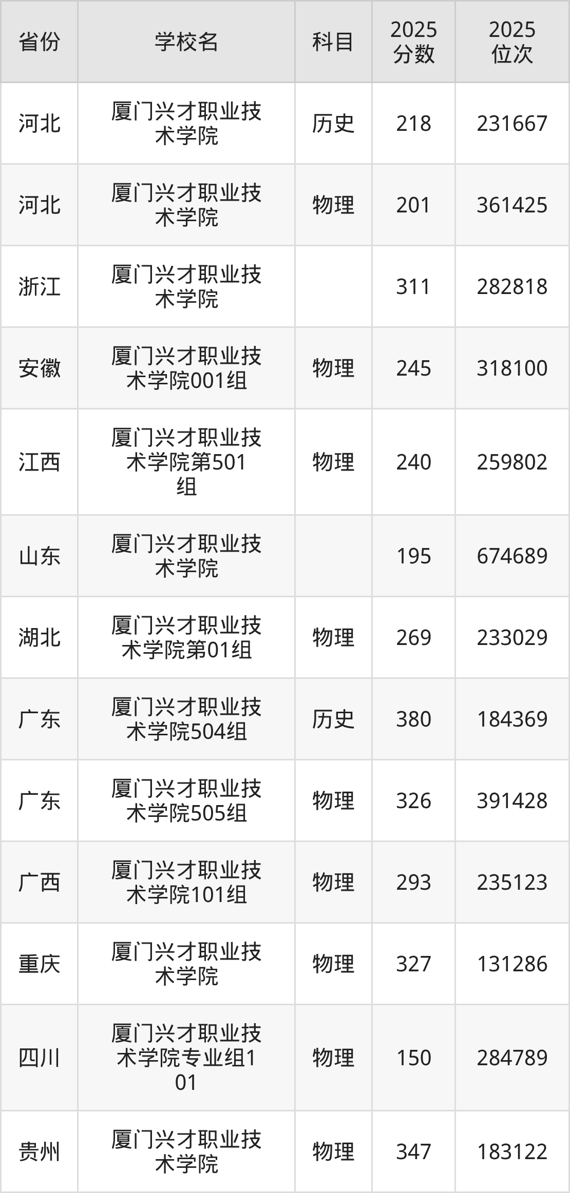 2026年厦门兴才职业技术学院录取分数线预计在260分及以上,在各省录取最低分存在一定差异,如:2025年厦门兴才职业技术学院在山东录取最低分是195分,在广西录取最低物理类293分,在重庆录取最低物理类327分。