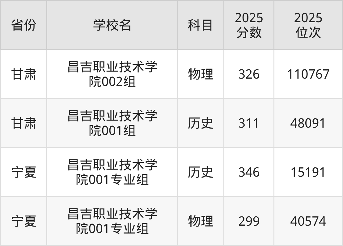 2026年昌吉职业技术学院录取分数线预计在300分及以上,在各省录取最低分存在一定差异,如:2025年昌吉职业技术学院在甘肃录取最低历史类311分、物理类326分,在宁夏录取最低历史类346分、物理类299分,在新疆录取最低文科287分、理科267分。
