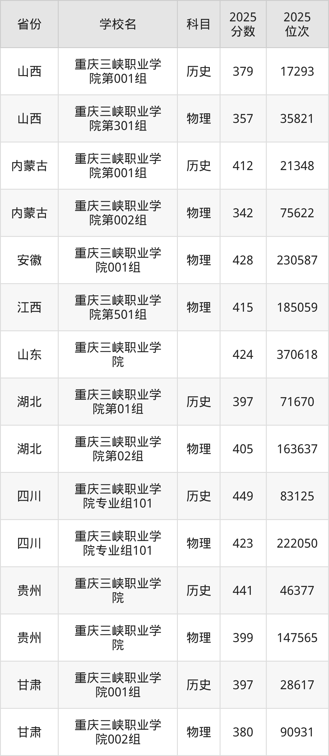 2025年重庆三峡职业学院在市内分历史物理科目类录取,其中历史类最低分是389分、对应位次是49804名;物理类最低分是363分,对应位次是124163名。